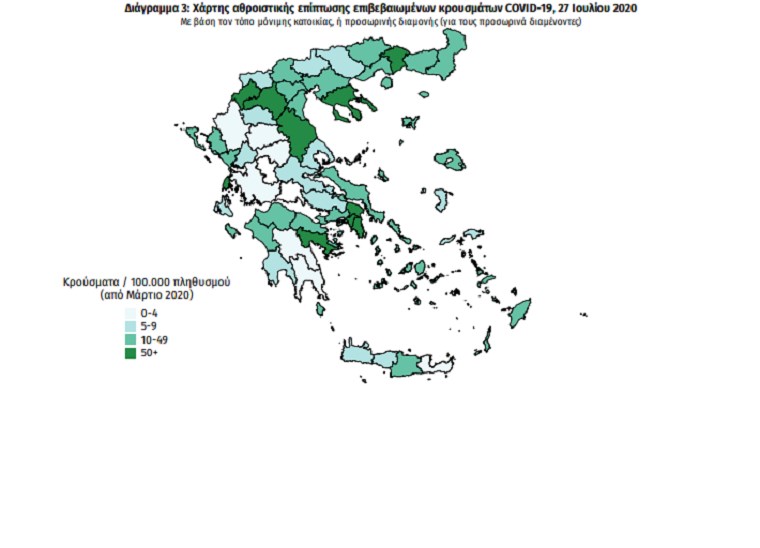Αυτός είναι ο χάρτης που αποτυπώνει τη γεωγραφική κατανομή των συνολικών κρουσμάτων κορονοϊού ανά Περιφερειακή Ενότητα της χώρας μας, με βάση την δηλωθείσα διεύθυνση μόνιμης κατοικίας του ασθενούς Τα στοιχεία που παρουσιάζονται αφορούν περιστατικά από την επιδημιολογική επιτήρηση της νόσου από το νέο κορωνοϊό (COVID19), με βάση τα δεδομένα που έχουν δηλωθεί στον ΕΟΔΥ και καταγραφεί μέχρι τις 27 Ιουλίου 2020 (ώρα 15:00). Τα νέα εργαστηριακά επιβεβαιωμένα κρούσματα της νόσου είναι 35, εκ των οποίων τα 4 εντοπίστηκαν κατόπιν ελέγχων στις πύλες εισόδου της χώρας. Ο συνολικός αριθμός των κρουσμάτων ανέρχεται σε 4227 (ημερήσια μεταβολή +0.8%), εκ των οποίων 54.6% άνδρες.