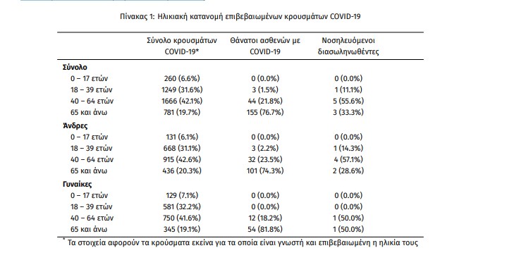 Από το σύνολο των 4227 κρουσμάτων, 1184 (28.0%) θεωρούνται σχετιζόμενα με ταξίδι από το εξωτερικό, 2118 (50.1%) είναι σχετιζόμενα με ήδη γνωστό κρούσμα και τα υπόλοιπα δεν σχετίζονται ούτε με ταξίδι ούτε με άλλο γνωστό κρούσμα ή είναι ακόμα υπό διερεύνηση. Η μέση ηλικία των κρουσμάτων είναι 47 έτη (εύρος 0 έως 102 ετών), ενώ η μέση ηλικία των θανάτων είναι 76 έτη (εύρος 35 έως 102 ετών). Η ηλικιακή κατανομή των (α) συνολικών κρουσμάτων, (β) των περιστατικών που κατέληξαν σε θάνατο και (γ) των ασθενών που νοσηλεύονται διασωληνωμένοι, είναι η ακόλουθη: