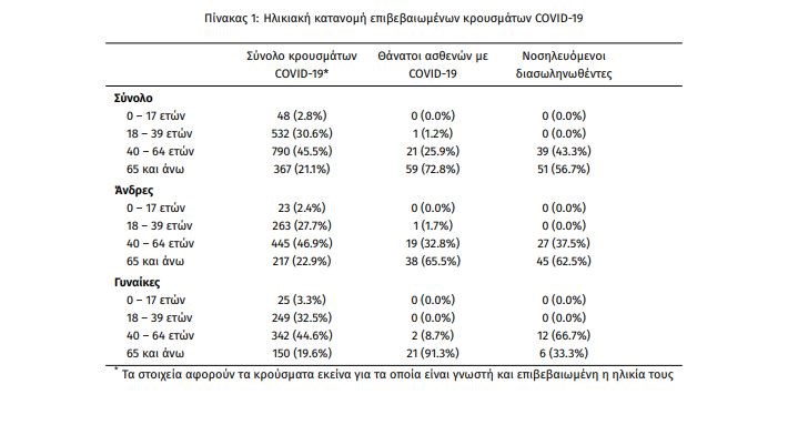 Από το σύνολο των 1832 κρουσμάτων, 501 (27.3%) θεωρούνται σχετιζόμενα με ταξίδι από το εξωτερικό, 679 (37.1%) είναι σχετιζόμενα με ήδη γνωστό κρούσμα και τα υπόλοιπα δεν σχετίζονται ούτε με ταξίδι ούτε με άλλο γνωστό κρούσμα ή είναι ακόμα υπό διερεύνηση. Η μέση ηλικία των κρουσμάτων είναι 49 έτη (εύρος 0 έως 101 ετών), ενώ η μέση ηλικία των θανάτων είναι 74 έτη (εύρος 39 έως 95 ετών). Η ηλικιακή κατανομή των (α) συνολικών κρουσμάτων, (β) των περιστατικών που κατέληξαν σε θάνατο και (γ) των ασθενών που νοσηλεύονται διασωληνωμένοι, είναι η ακόλουθη: