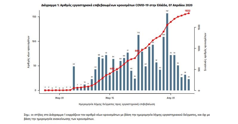Τα νέα επιβεβαιωμένα εργαστηριακά κρούσματα της νόσου είναι 77. Ο συνολικός αριθμός των κρουσμάτων ανέρχεται σε 1.832 (ημερήσια μεταβολή +4.4%), εκ των οποίων 55.0% άνδρες. Οι νέοι θάνατοι ασθενών με COVID-19 είναι δύο, ενώ από την έναρξη της επιδημίας έχουν καταγραφεί συνολικά 81 θάνατοι. Η μέση ηλικία των ασθενών που απεβίωσαν είναι 74 έτη. Ο αριθμός των ασθενών που νοσηλεύονται διασωληνωμένοι είναι 90 (78.9% άνδρες).