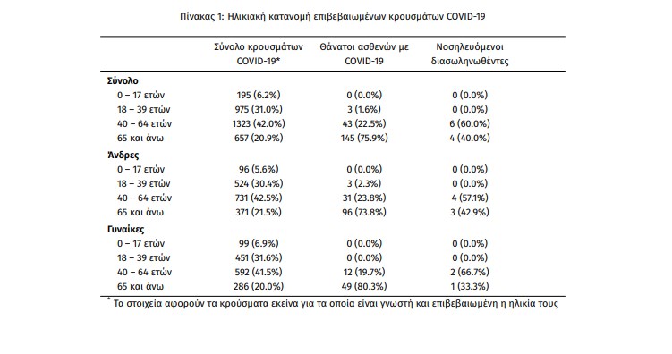 Χθες ανακοινώθηκαν 10 νέα κρούσματα κορονοϊού στη χώρα. Ο συνολικός αριθμός των κρουσμάτων είναι 3376, εκ των οποίων το 54.9% αφορά άνδρες. 754 (22.3%) θεωρούνται σχετιζόμενα με ταξίδι από το εξωτερικό και 1880 (55.7%) είναι σχετιζόμενα με ήδη γνωστό κρούσμα. Δέκα άνθρωποι νοσηλεύονται διασωληνωμένοι. Η διάμεση ηλικία τους είναι 60 ετών. 3 (30.0%) είναι γυναίκες και οι υπόλοιποι άνδρες. To 90.0% έχει υποκείμενο νόσημα ή είναι ηλικιωμένοι 70 ετών και άνω. 119 ασθενείς έχουν εξέλθει από τις ΜΕΘ. Τέλος, δεν έχει καταγραφεί κανένας νέος θάνατος ενώ έχουμε 191 θανάτους συνολικά στη χώρα. 61 (31.9%) γυναίκες και οι υπόλοιποι άνδρες. Η διάμεση ηλικία των θανόντων συμπολιτών, σύμφωνα με την ανακοίνωση του ΕΟΔΥ, ήταν τα 76 έτη και το 95.8% είχε κάποιο υποκείμενο νόσημα ή/και ηλικία 70 ετών και άνω.
