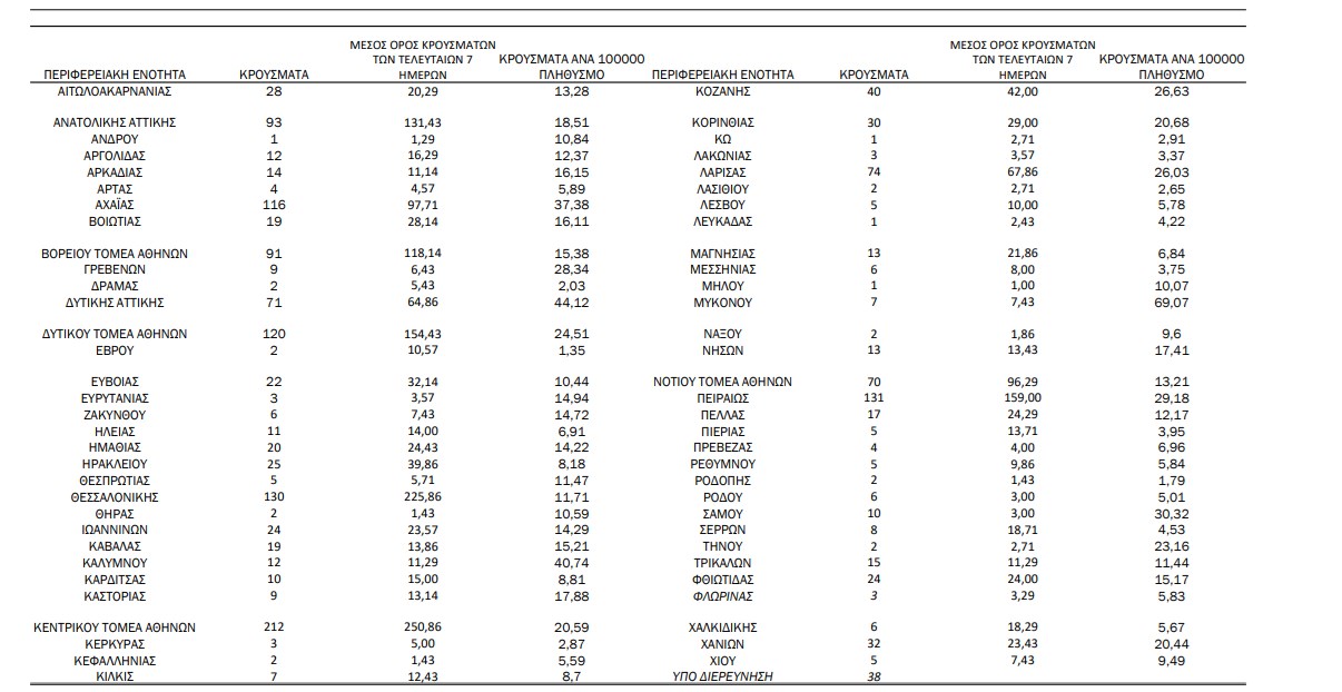 Ταυτόχρονα, μεγάλο ήταν και είναι το πρόβλημα στη Δυτική Αττική και τον Δυτικό Τομέα με 71 και 120 κρούσματα αντίστοιχα, ενώ και ο Πειραιάς «έδωσε» εκ νέου τριψήφιο αριθμό με 130. Στην Ανατολική Αττική εντοπίστηκαν 93 νέα κρούσματα, στα νότια προάστια 70 και στα νησιά 13.