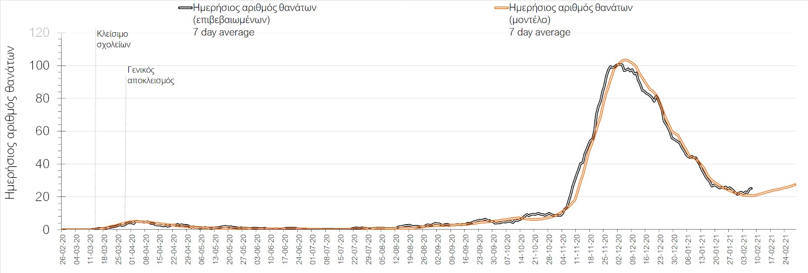 Σε ό,τι αφορά τον αριθμό των θανάτων, εκτιμούν ότι δεν αναμένεται να μειωθεί περαιτέρω κάτω από τους 20 (σε επίπεδο μέσης εβδομαδιαίας τιμής), με δεδομένη την αύξηση του αριθμού των κρουσμάτων και την αύξηση του αριθμού των διασωληνωμένων που έχει ήδη ξεκινήσει.