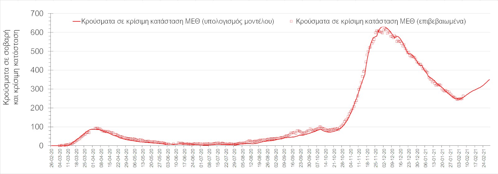 Αριθμός κρουσμάτων σε κρίσιμη κατάσταση (ΜΕΘ) σύμφωνα με τα στοιχεία του ΕΟΔΥ και τις προβλέψεις της υπολογιστικής πλατφόρμας CORE.