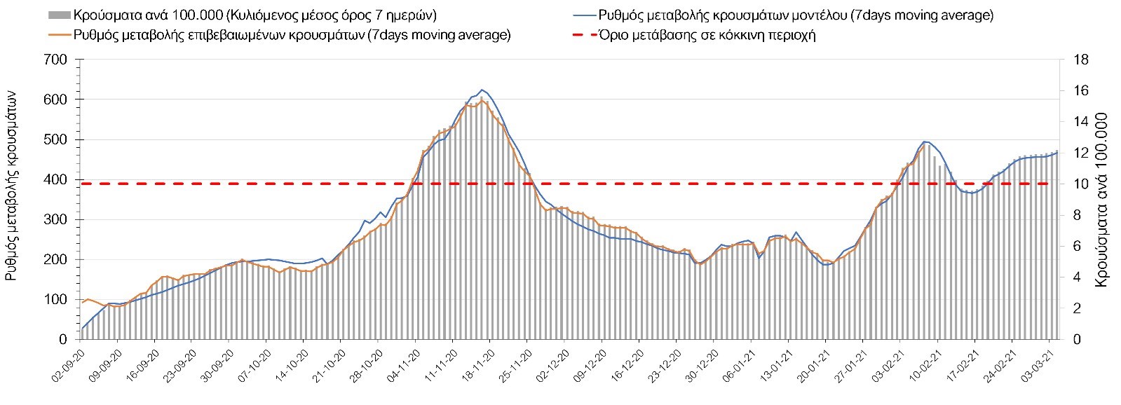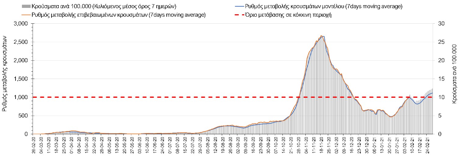 Πορεία του ημερησίου αριθμού των κρουσμάτων (κυλιόμενος μέσος όρος 7 ημερών) στην Ελληνική επικράτεια