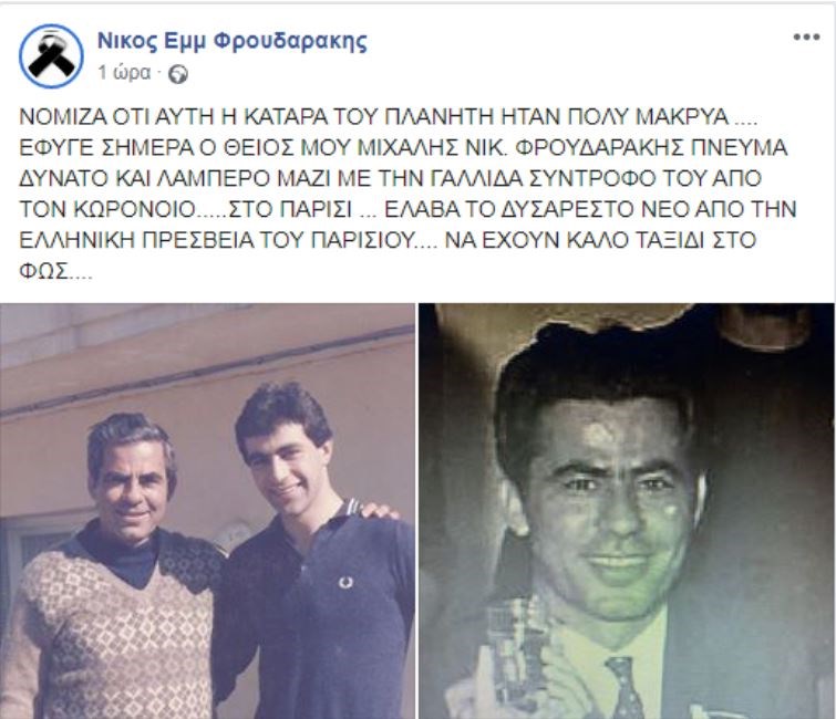Τη θλιβερή είδηση γνωστοποίησε ο ανιψιός του εκλιπόντος, πιλότος, Νίκος Εμμ. Φρουδαράκης, με μια συγκινητική ανάρτηση στο facebook.