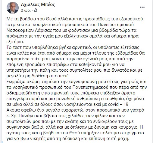 Εκφράζω ακόμη δημόσια την ευγνωμοσύνή μου στους γιατρούς και το νοσηλευτικό προσωπικό του Πανεπιστημιακού που πέρα από την αδιαμφισβήτητη επιστημονική τους επάρκεια επέδειξαν άριστο επαγγελματισμό και μια μοναδική ανθρώπινη ευαισθησία, όχι μόνο σε μένα αλλά σε όλους όσοι νοσηλεύονται εκεί με covid – 19.