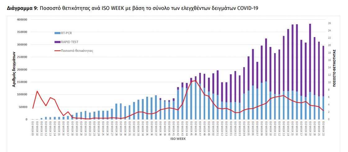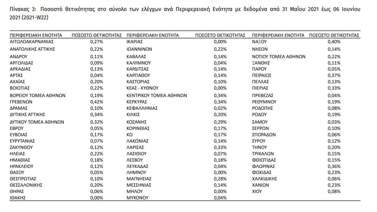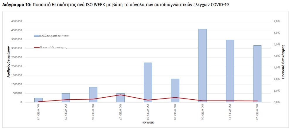 Σε σύνολο 3.151.519 αυτοδιαγνωστικών ελέγχων το ποσοστό θετικότητας ήταν 0,12%. Στο σύνολο των ελέγχων, το ποσοστό θετικότητας για την εβδομάδα 31 Μαΐου 2021 με 06 Ιουνίου 2021 ήταν 0,22%.