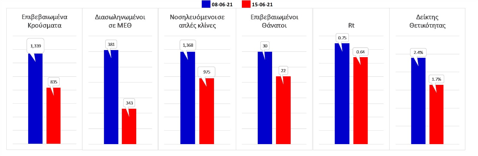 Σχήμα 53. Συγκριτικά αποτελέσματα της επιδημιολογικής εικόνας της σημερινής Τρίτης (15/6/2021) σε σχέση με την προηγούμενη (8/6/2021) Όσον αφορά επιμέρους περιοχές, αν και όλες σχεδόν βρίσκονται σε πτωτική πορεία, ανάγκη επιτήρησης έχουν περιοχές οι οποίες πρόσφατα αποχαρακτηρίστηκαν από κόκκινες με κάποιες από αυτές να είναι οριακές όπως είναι η Αττική, η Λάρισα, η Βοιωτία, η Εύβοια, η Κοζάνη, η Φλώρινα, η Πιερία, τα Χανιά και η Κέρκυρα.Με βάση τον υψηλό αριθμό των self-test που πραγματοποιείται τις τελευταίες εβδομάδες, πλέον δεν αναμένουμε αναστροφή της πορείας αποκλιμάκωσης, αρκεί να συνεχιστεί η συμμόρφωση με τα ισχύοντα μέτρα περιορισμού της πανδημίας (χρήση μάσκας και περιορισμοί που αφορούν κυρίως κλειστούς χώρους) και κυρίως η συνέχιση των self-test σε όσο το δυνατόν μεγαλύτερο τμήμα του πληθυσμού (με έμφαση στους εργαζόμενους σε δραστηριότητες με μεγάλο αριθμό ενεργών επαφών). Επίσης, σύμφωνα με τα πιο πρόσφατα στοιχεία που έγιναν διαθέσιμα, ανησυχία πλέον δημιουργεί η αύξηση του ποσοστού διασποράς του μεταλλαγμένου στελέχους Β.1.1.318 σε συγκεκριμένες περιοχές για το 15νθήμερο από 10/05/2021 έως 23/05/2021, όπου οι αντίστοιχες ποσοστώσεις είναι 17.57% για την Αττική, 52.11% για τη Στερεά Ελλάδα, 40% για την Ήπειρο και 19.28% για την Πελοπόννησο. Από τα αρχικά δεδομένα που έχουμε, διαφαίνεται να είναι πιο μεταδοτικό από το μεταλλαγμένο στέλεχος Β.1.1.7 που επικρατεί στο σύνολο της χώρας κατά περίπου 30% (και θα επανέλθουμε με πιο ακριβή στοιχεία για τη συγκεκριμένη εκτίμηση, όταν περισσότερα δεδομένα θα είναι διαθέσιμα), και με δεδομένη την απελευθέρωση των διαπεριφερειακών μετακινήσεων, χρειάζεται να δοθεί έμφαση στον άμεσο περιορισμό της διασποράς του, ενώ περαιτέρω εξάπλωση του θα οδηγήσει σε αναθεωρημένες προβλέψεις της επιδημιολογικής πορείας. Η αναχαίτιση του 3ου κύματος που παρατηρείται οφείλεται σε ένα συνδυασμό παραμέτρων, οι οποίες είναι