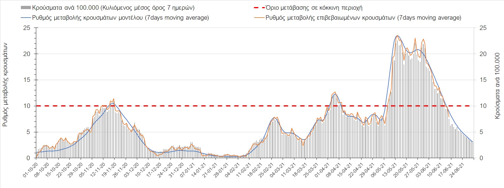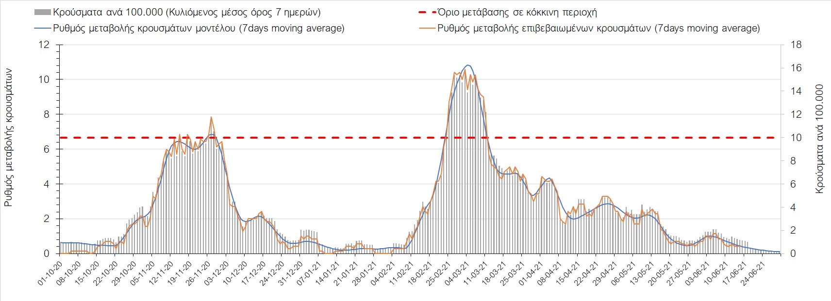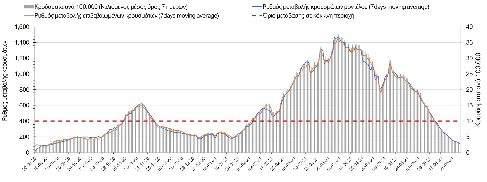 - σε μικρότερο βαθμό η πρόοδος των εμβολιασμών, η σημασία των οποίων στον έλεγχο της πανδημίας θα αρχίσει να είναι πιο εμφανής από το τέλος του Ιουνίου, λαμβάνοντας υπόψιν τη σημαντική αύξηση του ρυθμού εμβολιασμού από τα μέσα Απριλίου, με περίπου 110.000 εμβολιασμούς ημερησίως. Αξίζει να σημειωθεί ότι τις τελευταίες ημέρες παρατηρείται μια επιβράδυνση του ρυθμού εμβολιασμού. Τις επόμενες ημέρες, θα παρουσιάσουμε τις αναθεωρημένες προβλέψεις μας, λαμβάνοντας υπόψη την επιβράδυνση αυτή, οι επιπτώσεις της οποίας θα φανούν μετά τις αρχές Ιουλίου.