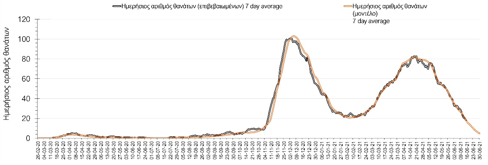 Σχήμα 3. Αριθμός θανάτων (κυλιόμενος μέσος όρος 7 ημερών) σύμφωνα με τα στοιχεία του ΕΟΔΥ και τις προβλέψεις της υπολογιστικής πλατφόρμας CORE.Η πορεία της μέσης εβδομαδιαίας τιμής των κρουσμάτων, καθώς και του κυλιόμενου μέσου όρου 7 ημερών του αριθμού των κρουσμάτων ανά 100.000 πληθυσμού, όπως έχουν καταγραφεί από τον ΕΟΔΥ και η αναμενόμενη πορεία τους όπως προδιαγράφεται από την υπολογιστική πλατφόρμα CORE για την Ελληνική επικράτεια μέχρι τις 30 Ιουνίου, αποτυπώνονται στο Σχήμα 4. Με βάση το συνδυασμένο άνοιγμα της εστίασης στις 3 Μαΐου, και των υπόλοιπων βαθμίδων εκπαίδευσης (Δημοτικά και Γυμνάσια) στις 10 Μαΐου, αναμέναμε την επιβράδυνση της πορείας αποκλιμάκωσης, με σημαντική πιθανότητα να υπάρξει και ένα μικρό ανοδικό κύμα το τελευταίο δεκαήμερο του Μαΐου. Εντούτοις, φάνηκε ότι ο συνδυασμός των self–test με την άνοδο της θερμοκρασίας, συνέβαλαν καθοριστικά και με αυξημένη αποτελεσματικότητα στον περιορισμό της εξάπλωσης της πανδημίας. Με βάση την επικαιροποιημένη πρόβλεψη που πραγματοποιήσαμε, σύμφωνα με τον αριθμό των κρουσμάτων που παρατηρείται αυτές τις ημέρες, δεν αναμένουμε πλέον την προσωρινή αναστροφή της πορείας αποκλιμάκωσης. Αντίθετα, αναμένουμε τη συνέχιση της αποκλιμάκωσης, η οποία θα υποβοηθηθεί περαιτέρω από τον υπάρχοντα ρυθμό εμβολιασμών και τη δημιουργία τείχους ανοσίας. Πρέπει επίσης να σημειωθεί, ότι με βάση την επικαιροποιημένη ανάλυση των δεδομένων διασποράς της πανδημίας στη χώρα, παρατηρήθηκε αύξηση των ενεργών επαφών τις τελευταίες ημέρες του Απριλίου. Αυτές μπορούν να οφείλονται στο άνοιγμα των μεγάλων εμπορικών κέντρων (να σημειωθεί ότι έγινε χωρίς την εγκατάσταση συσκευών απολύμανσης του αέρα αν και πρόκειται για εσωτερικούς χώρους με ανάγκη τεχνητού εξαερισμού) και στην κίνηση της αγοράς λόγω του Πάσχα, αλλά και στις αυξημένες κοινωνικές επαφές κατά τη διάρκεια των εορτών του Πάσχα. Αντίθετα, η εφαρμογή του μέτρου των self–test (σε μαθητές, εκπαιδευτικούς και εργαζομένους σε διάφορους τομείς οικονομικών δραστηριοτήτων που άνοιξαν), συντέλεσε στο να μη γίνει αναστροφή της πορείας αποκλιμάκωσης. Αυτή η προβλεπόμενη πορεία, που αφορά τα κρούσματα, τους νοσηλευόμενους σε απλές κλίνες, όσο και σε ΜΕΘ, καθώς επίσης και τους θανάτους, βασίζεται στις ακόλουθες παραδοχές:
