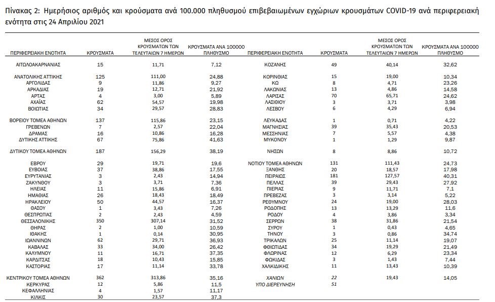 Αναλυτικά η κατανομή των 2.590 νέων εγχώριων κρουσμάτων ανά Περιφερειακή Ενότητα παρουσιάζεται στον παρακάτω πίνακα: