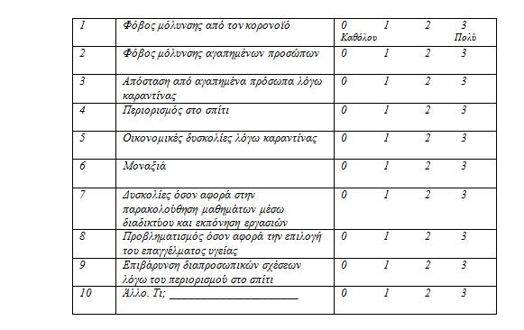 Παρακάτω δίνεται ένα ερωτηματολόγιο παραγόντων που συμβάλουν αυτή την περίοδο στην αύξηση του στρες. Μοιραστείτε τις απαντήσεις σας με συμφοιτητές σας ή αγαπημένα σας πρόσωπα και αναζητείστε εποικοδομητικούς τρόπους για να τους διαχειριστείτε