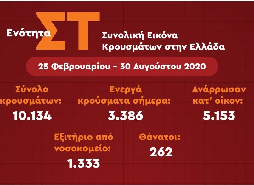 Τα στατιστικά για την πανδημία του κορονοϊού στην Ελλάδα δημοσιοποίησε την Τρίτη (1/9) η Γενική Γραμματείας Πολιτικής Προστασίας, αποκαλύπτοντας τον αριθμό των ενεργών κρουσμάτων στη χώρα μας.