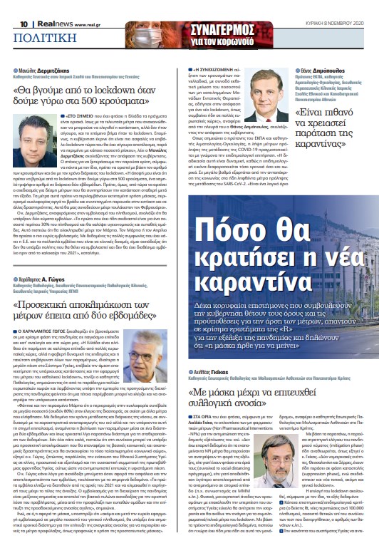 Γιατί φτάσαμε στο lockdown; Ηταν σωστή η απόφαση της κυβέρνησης και τι έπεται στη συνέχεια όσον αφορά την πορεία των κρουσμάτων; Δέκα διακεκριμένοι Έλληνες επιστήμονες μιλούν στη Realnews για την εξέλιξη της πανδημίας στη χώρα μας, για τα δεδομένα που σήμαναν συναγερμό στην κυβέρνηση και οδήγησαν στην απόφαση για την εφαρμογή ενός καθολικού lockdown, παρά τις οδυνηρές συνέπειες στην οικονομία και στην κοινωνία. Σύσσωμοι οι επιστήμονες κάνουν λόγο για μη τήρηση των μέτρων μέχρι σήμερα από μεγάλη μερίδα του πληθυσμού, γεγονός που οδήγησε στην εκθετική αύξηση των κρουσμάτων COVID-19. Ξεκαθαρίζουν ότι «η χρήση μάσκας ήρθε για να μείνει για πολύ καιρό ακόμη», τουλάχιστον μέχρι το πέρας της πανδημίας, ενώ αναφερόμενοι στο πολυπόθητο εμβόλιο δηλώνουν κατηγορηματικά ότι, ακόμη και αν εγκριθεί ένα ασφαλές και αποτελεσματικό εμβόλιο στις αρχές του 2021, η μαζική διάθεσή του στον πληθυσμό θα καθυστερήσει για πολλούς μήνες… ‘