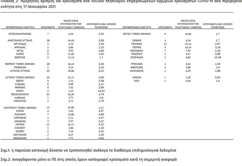 Ειδικά στην Αττική, τα νέα κρούσματα κατανέμονται ως εξής: στην Ανατολική Αττική βρέθηκαν 18 νέα κρούσματα, στον Βόρειο Τομέα Αθηνών επίσης 18, στη Δυτική Αττική 10, στον Δυτικό Τομέα Αθηνών 15, στον Κεντρικό Τομέα Αθηνών 12, στον Νότιο Τομέα Αθηνών 9, ενώ στον Πειραιά εντοπίστηκαν ακόμα 12 κρούσματα κορονοϊού.