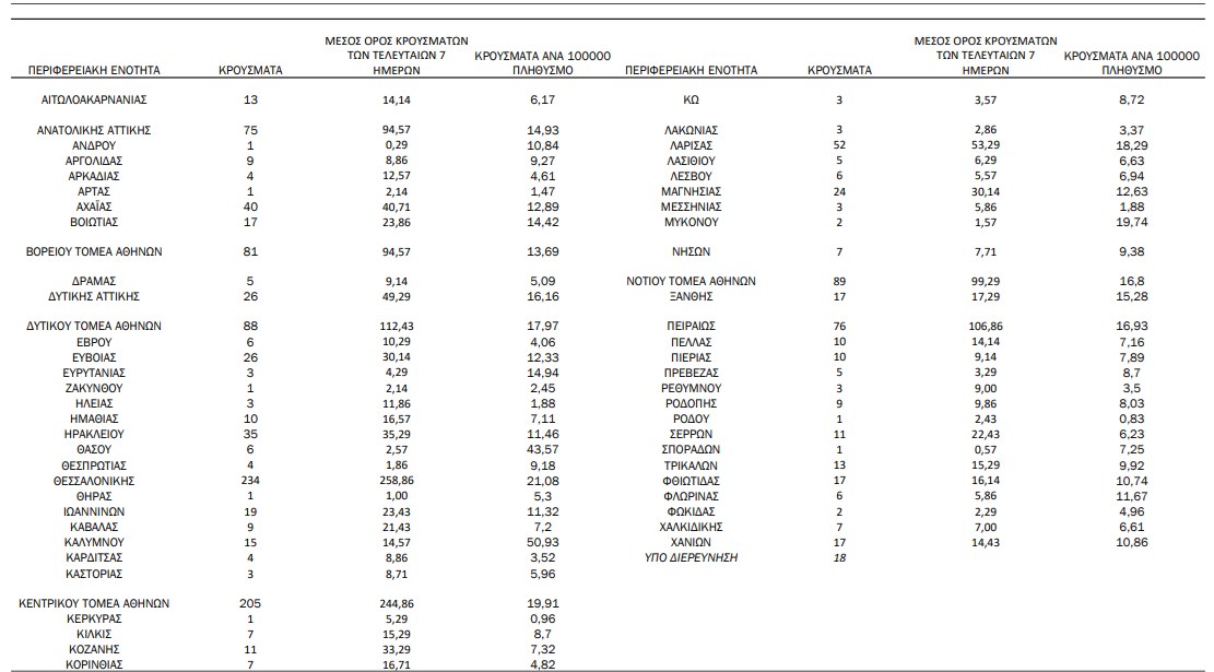 Από τα 1.387 νέα εγχώρια κρούσματα τα 647 καταγράφηκαν στο λεκανοπέδιο, ενώ ενώ 234 εντοπίστηκαν στη Θεσσαλονίκη. Υψηλά νούμερα παρουσίασαν η Αχαΐα (40), το Ηράκλειο (35), η Λάρισα (52), η Εύβοια (26) και η Μαγνησία (24).