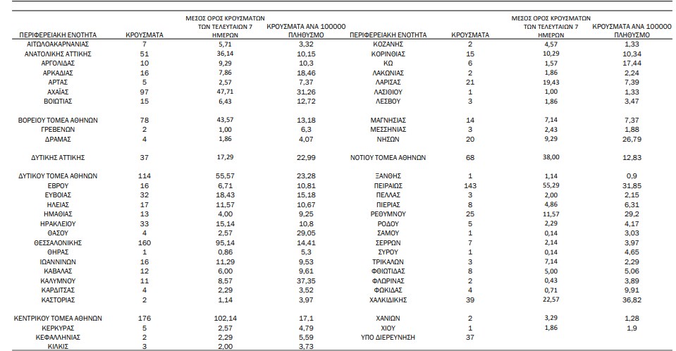Στη συμπρωτεύουσα υπήρξαν 160 νέα κρούσματα, ενώ στην Αχαΐα καταγράφηκαν 97. Στην Εύβοια υπήρξαν 32 νέες διαγνώσεις, στην Κάλυμνο 11, ενώ στη Χαλκιδική εντοπίστηκαν 39 νέα κρούσματα.