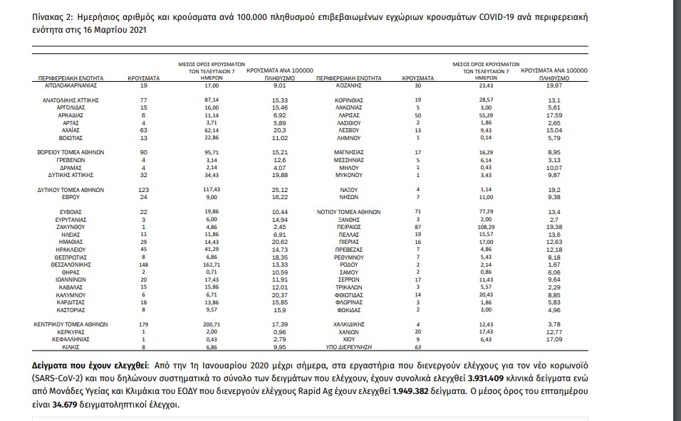 Το τελευταίο 24ωρο επιβεβαιώθηκαν 1.533 νέα κρούσματα κορονοϊού στη χώρα μας, σύμφωνα με τα όσα ανακοίνωσε ο ΕΟΔΥ το απόγευμα της Τρίτης. Από το σύνολο των 1.533 νέων κρουσμάτων του νέου ιού στη χώρα, 30 είναι εισαγόμενα εκ των οποίων 27 εντοπίστηκαν κατόπιν ελέγχων στις πύλες εισόδου. Η κατανομή των 1.503 νέων εγχώριων κρουσμάτων ανά Περιφερειακή Ενότητα παρουσιάζεται στον παρακάτω πίνακα.