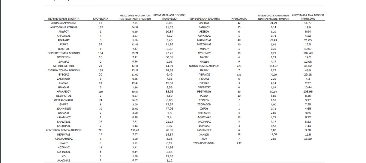 Έτσι βάσει της κατανομής των 2.085 νέων εγχώριων κρουσμάτων, τα 1.115 καταγράφονται στο Λεκανοπέδιο με την Κρήτη να προκαλεί μεγάλο προβληματισμό και αυτό γιατί εντοπίστηκαν 119 στο Ηράκλειο, 15 στο Λασίθι, 89 στο Ρέθυμνο και 18 στα Χανιά.