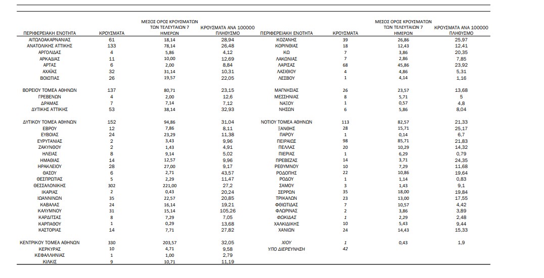 Έτσι βάσει της κατανομής των 2.135 νέων εγχώριων κρουσμάτων, στην Αττική εντοπίστηκαν 1.022 νέες μολύνσεις, ενώ στη Θεσσαλονίκη 302. Υψηλά νούμερα καταγράφηκαν επίσης στην Αιτωλοακαρνανία (62), στην Αχαΐα (32), στο Ηράκλειο (28), στα Ιωάννινα (35), στη Λάρισα (68), στην Κοζάνη (39), στις Σέρρες (35) και στα Χανιά (24).