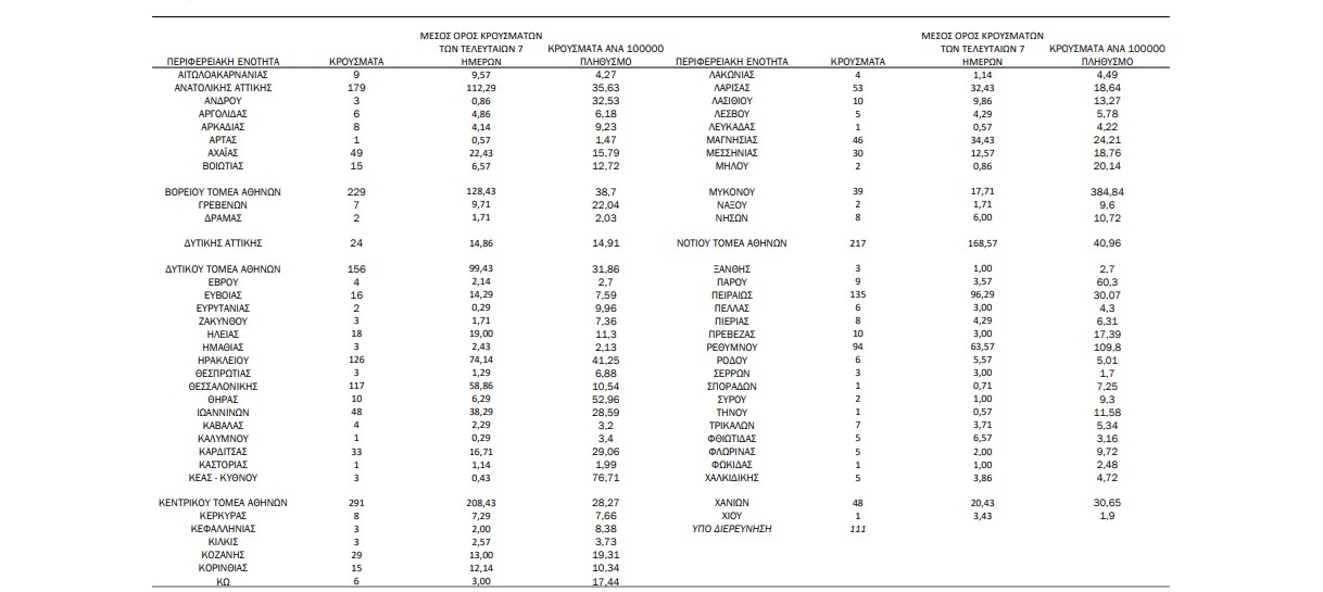 Διψήφιο αριθμό νέων μολύνσεων παρουσιάζουν επίσης η Αχαΐα (49), η Βοιωτία (15), η Εύβοια (16), η Ηλεία (18), η Θήρα (10), τα Ιωάννινα (48), η Καρδίτσα (33), η Κοζάνη (29), η Κορινθία (15), η Λάρισα (53), η Μαγνησία (46), η Μεσσηνία (30), η Μύκονος (39), η Πρέβεζα (10), ενώ 111 τελούν υπό διερεύνηση.