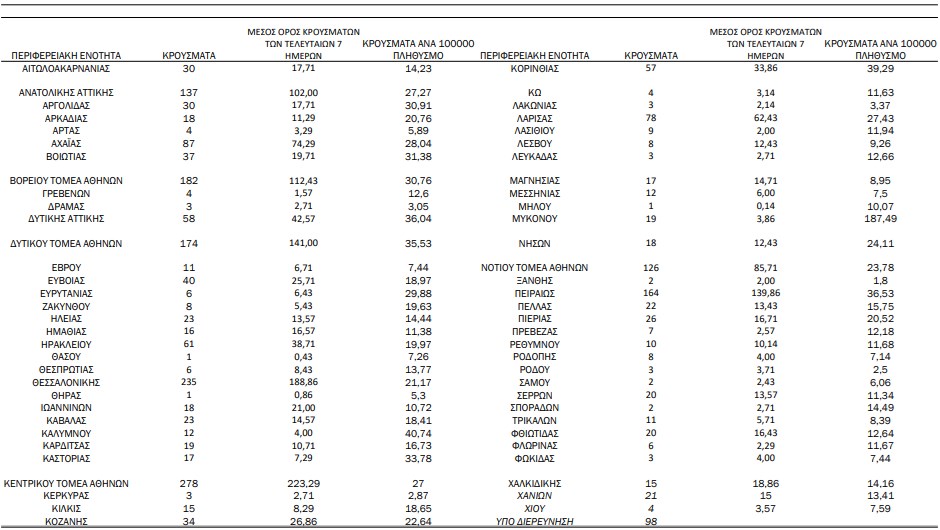 Ταυτόχρονα προβληματική παραμένει η κατάσταση στη Θεσσαλονίκη με 237 κρούσματα και στην Αχαΐα με 87. Υψηλά νούμερα καταγράφονται επίσης σε: Αργολίδα (30), Αρκαδία (18), Βοιωτία (37), Εύβοια (40), Ηράκλειο (61), Καβάλα (23), Κάλυμνο (12), Καρδίτσα (19), Καστοριά (17), Κοζάνη (34), Κορινθία (54), Λάρισα (78), Μύκονο (19), Πιερία (26), Σέρρες (20), Φθιώτιδα (20), Χαλκιδική (15) και Χανιά (21).