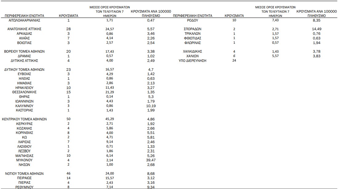 Έτσι βάσει της κατανομής των 343 νέων εγχώριων κρουσμάτων, τα 187 εντοπίστηκαν στο λεκανοπέδιο, ενώ 15 καταγράφηκαν στη Θεσσαλονίκη. Διψήφιο αριθμό νέων μολύνσεων παρουσίασαν επίσης το Ηράκλειο (10), η Μαγνησία (10) και η Ρόδος (10), ενώ 24 τελούν υπό διερεύνηση.