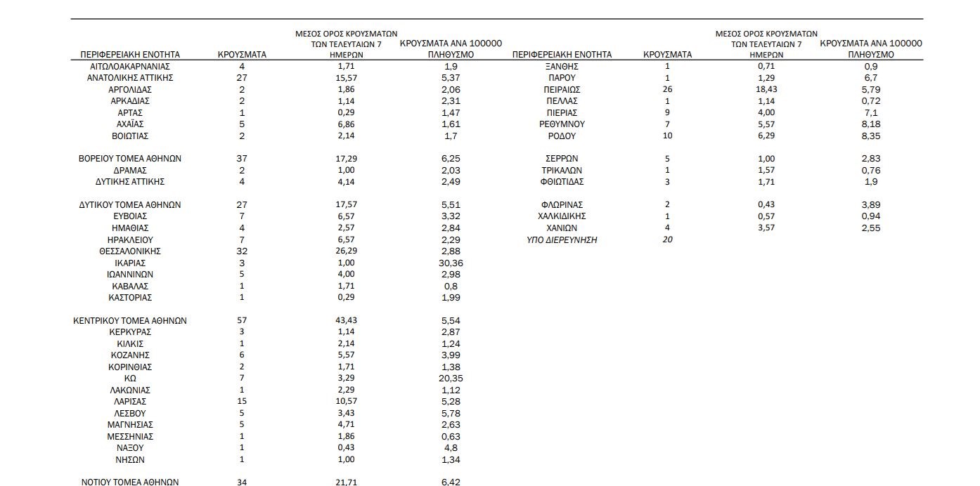 Ο ΕΟΔΥ ανακοίνωσε 406 νέα κρούσματα κορονοϊού το απόγευμα της Τρίτης. Περισσότερα από τα μισά καταγράφηκαν στην Αττική, για την ακρίβεια 213. Στη Θεσσαλονίκη εντοπίστηκαν μόλις 32 νέες μολύνσεις το τελευταίο 24ωρο. Ακολουθούν η Λάρισα με 15 κρούσματα, η Ρόδος με 10, η Πιερία με 9, το Ηράκλειο με 7, η Εύβοια με 7, το Ρέθυμνο με 7 και η Κως με 7.