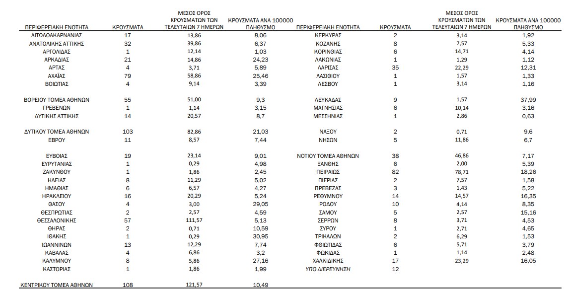 Συγκεκριμένα από τα 437 νέα κρούσματα, ο Δυτικός Τομέας κατέγραψε 103 νέες μολύνσεις και η Δυτική Αττική 14, ενώ στο κέντρο της πόλης εντοπίστηκαν 108. Στην Ανατολική Αττική 32, στον Βόρειο Τομέα 55, στα Νησιά 5, στον Νότιο Τομέα 38 και στον Πειραιά 82.