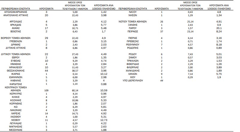 Έτσι βάσει της κατανομής των 515 νέων εγχώριων μολύνσεων στην Επικράτεια, τα 252 καταγράφηκαν στη χώρα, ενώ τα 44 στη Θεσσαλονίκη. Διψήφιος αριθμός κρουσμάτων εντοπίστηκαν επίσης στη Λάρισα (14), στη Λέσβο (11), στην Εύβοια (10), στο Ηράκλειο Κρήτης (10), στην Αχαΐα (17), ενώ 44 τελούν υπό διερεύνηση.