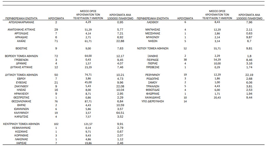 Έτσι βάσει της κατανομής των 722 νέων εγχώριων κρουσμάτων ανά Περιφερειακή Ενότητα, η Αττική και πάλι «έδωσε» τα περισσότερα, σχεδόν το 50%, ενώ προβληματική παραμένει η κατάσταση στην Αχαΐα με 71, αλλά και στη Θεσσαλονίκη με 76.