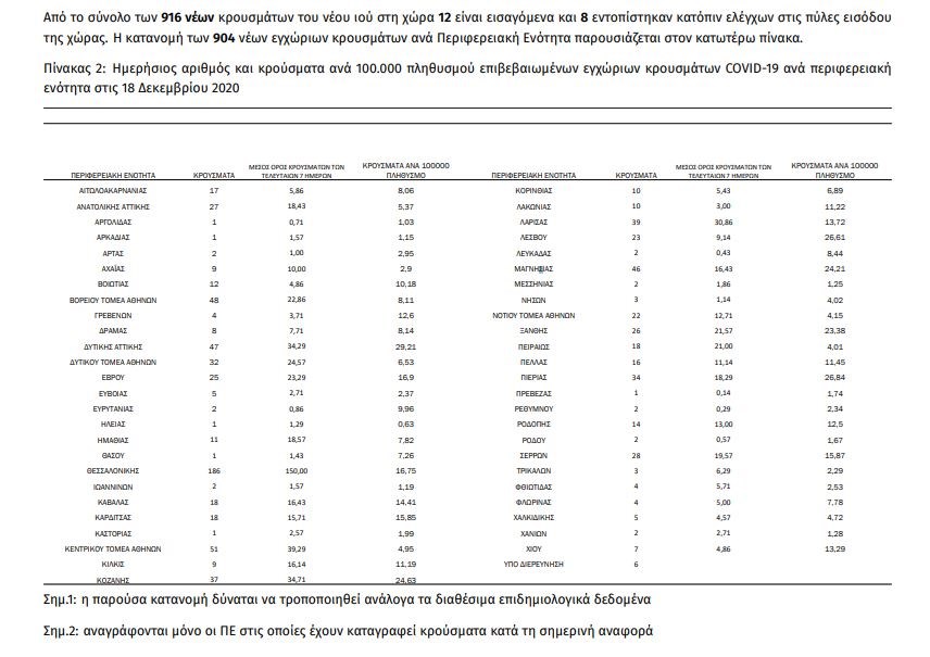 Από το σύνολο των 916 νέων κρουσμάτων του κορονοϊού στη χώρα 12 είναι εισαγόμενα και 8 εντοπίστηκαν κατόπιν ελέγχων στις πύλες εισόδου της χώρας.