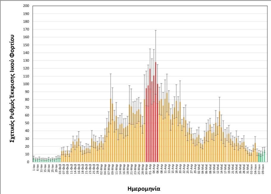 Η συγκέντρωση του ιικού φορτίου στα λύματα βρίσκεται στα επίπεδα των πρώτων ημερών του Φεβρουαρίου, όταν ξεκινούσε το τελευταίο κύμα της πανδημίας, που διήρκησε τέσσερις μήνες. Στα διαγράμματα που παρουσιάζει το ΑΠΕ-ΜΠΕ, οι ημέρες των δειγματοληψιών που καταγράφονται με κόκκινο χρώμα αντιστοιχούν σε περισσότερα από 500 κρούσματα -όπως ανακοινώθηκαν τις αντίστοιχες ημέρες από τον ΕΟΔΥ- οι ημέρες που καταγράφονται με πορτοκαλί σε 100-400 κρούσματα και οι ημέρες που καταγράφονται με πράσινο σε λιγότερα από 100 κρούσματα.
