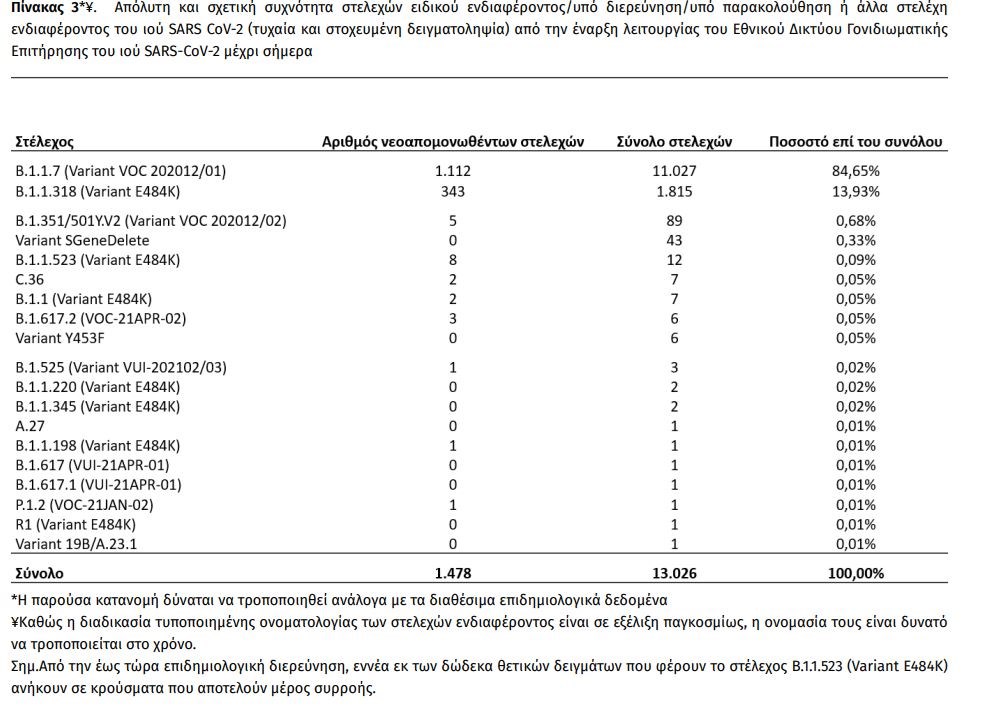 Ολοκληρώθηκε από το Eθνικό Δίκτυο Γονιδιωματικής Επιτήρησης του ιού SARS-CoV-2, που λειτουργεί υπό το συντονισμό του ΕΟΔΥ, η γονιδιωματική ανάλυση σε 1.567 δείγματα που έχουν επιλεγεί τυχαιοποιημένα ή στοχευμένα και αφορούν στην περίοδο 15 Απριλίου έως 27 Μαΐου 2021. Από τον έλεγχο των 1.567 δειγμάτων, αναδείχθηκαν συνολικά 1.121 δείγματα με στελέχη ειδικού ενδιαφέροντος (Variants Of Concern – VOC) και 345 δείγματα με στελέχη υπό παρακολούθηση (Variants Under Monitoring). Εκ των 1.121 δειγμάτων με στελέχη ειδικού ενδιαφέροντος, τα 1.112 αφορούν στο Β.1.1.7 (Variant VOC 202012/01), 5 αφορούν στο B.1.351/501Y.V2 (Variant VOC 202012/02), 3 αφορούν στο B.1.617.2 (VOC-21APR-02) και 1 αφορά στο P.1.2 (VOC-21JAN-02). Εκ των 345 δειγμάτων με στελέχη υπό παρακολούθηση, τα 343 αφορούν στο στέλεχος B.1.1.318 (Variant E484K) και 2 αφορούν στο C.36. Επιπλέον, αναδείχθηκαν 8 δείγματα με στέλεχος B.1.1.523 (Variant E484K), 2 με το Β.1.1 (Variant E484K), 1 με B.1.525 (Variant VUI-202102/03) και 1 με B.1.1.198 (Variant E484K) (Πίνακας 3). Από την έναρξη λειτουργίας του Εθνικού Δικτύου Γονιδιωματικής Επιτήρησης του ιού SARS-CoV-2 μέχρι σήμερα έχουν ελεγχθεί στην επικράτεια συνολικά 15.909 δείγματα από εγχώρια κρούσματα. Εξ αυτών 13.931 προέρχονται από τυχαία επιλογή δειγμάτων, 1.325 προέρχονται από στοχευμένη λήψη ή επιλογή δειγμάτων και για 653 δείγματα δεν είναι διαθέσιμος ο τρόπος επιλογής. Μεταξύ των 13.931 τυχαία επιλεγμένων δειγμάτων στην επικράτεια, τα τρία πιο συχνά στελέχη ειδικού ενδιαφέροντος ή υπό διερεύνηση που έχουν απομονωθεί είναι το Β.1.1.7 (Variant VOC 202012/01), με ποσοστό 77,10%, ακολουθούμενο από το B.1.1.318 (Variant E484K) με ποσοστό 7,62% και το B.1.351/501Y.V2 (Variant VOC 202012/02) με ποσοστό 0,32% (Πίνακας 4). Η διαχρονική εξέλιξη της σχετικής συχνότητας των αλληλουχηθέντων δειγμάτων από τυχαία δειγματοληψία ανά είδος στελεχών, μέχρι και την εβδομάδα 20 απεικονίζεται στο Διάγραμμα 1. Από τα 1.325 δείγματα που έχουν ληφθεί ή επιλεγεί στοχευμένα, έχουν βρεθεί 1.185 στελέχη ειδικού ενδιαφέροντος ή υπό παρακολούθηση, εκ των οποίων 29,28% αφορούν στο στέλεχος Β.1.1.7 (Variant VOC 202012/01), 64,98% στο B.1.1.318 (Variant E484K) και 3,46% στο B.1.351/501Y.V2 (Variant VOC 202012/02). Επιπλέον, έχουν απομονωθεί συνολικά 106 στελέχη ειδικού ενδιαφέροντος ή υπό διερεύνηση ή ενδιαφέροντος από δείγματα εισαγόμενων κρουσμάτων, εκ των οποίων 100 αφορούν στο Β.1.1.7 (Variant VOC-202012/01), 4 στο B.1.351/501Y.V2 (Variant VOC 202012/02), 1 στο B.1.525 (Variant VUI-202102/03) και 1 στο Β.1.617.1 (VUI-21APR-01).