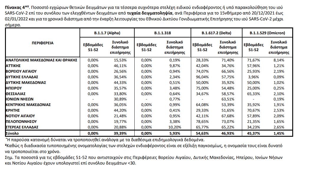 Ολοκληρώθηκε από το Eθνικό Δίκτυο Γονιδιωματικής Επιτήρησης του ιού SARS-CoV-2, που λειτουργεί υπό το συντονισμό του ΕΟΔΥ, η γονιδιωματική ανάλυση σε 1.007 δείγματα που έχουν επιλεγεί τυχαιοποιημένα ή στοχευμένα και αφορούν στην περίοδο 01 Δεκεμβρίου 2021 έως 03 Ιανουαρίου 2022. Από τον έλεγχο των 1.007 δειγμάτων, αναδείχθηκαν συνολικά 976 δείγματα με στελέχη ειδικού ενδιαφέροντος (Variants Of Concern – VOC).