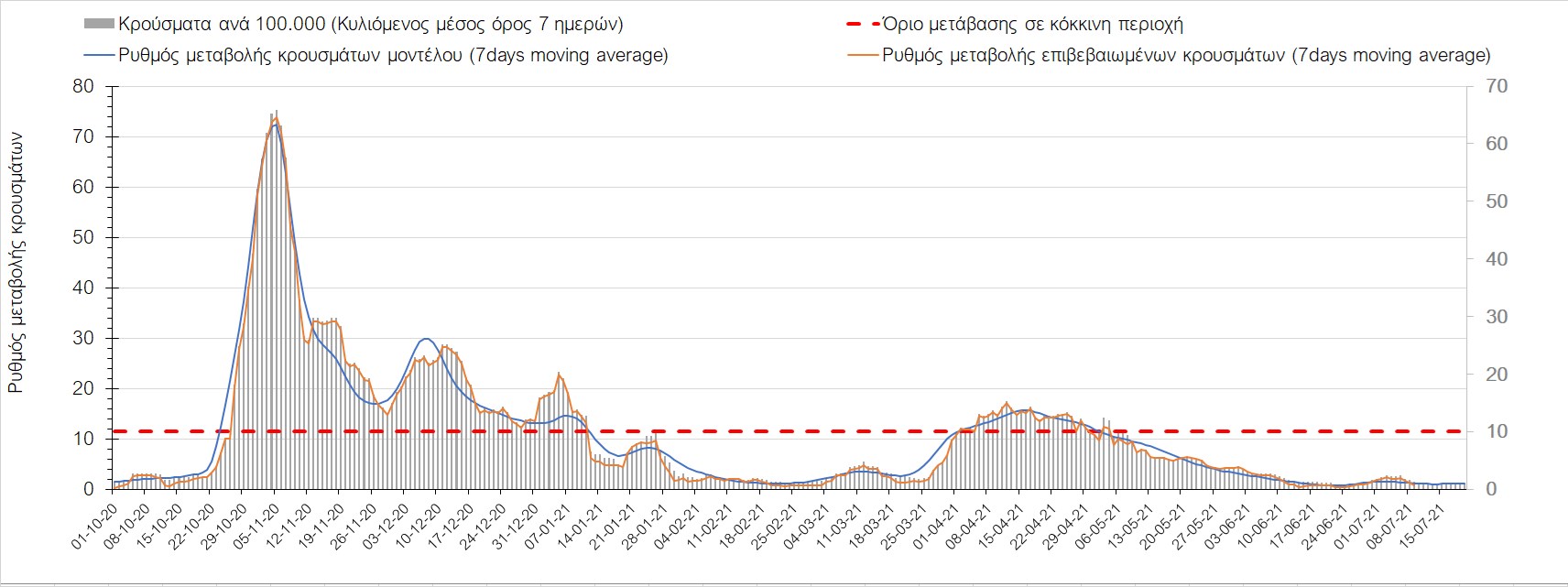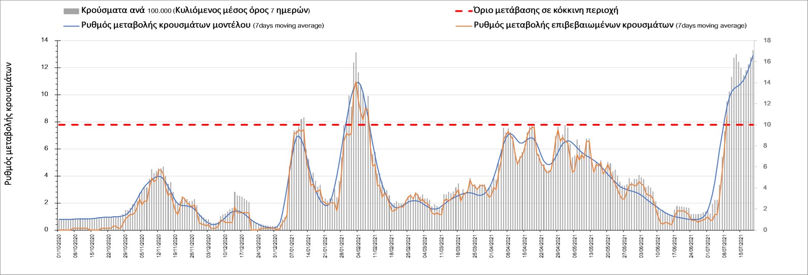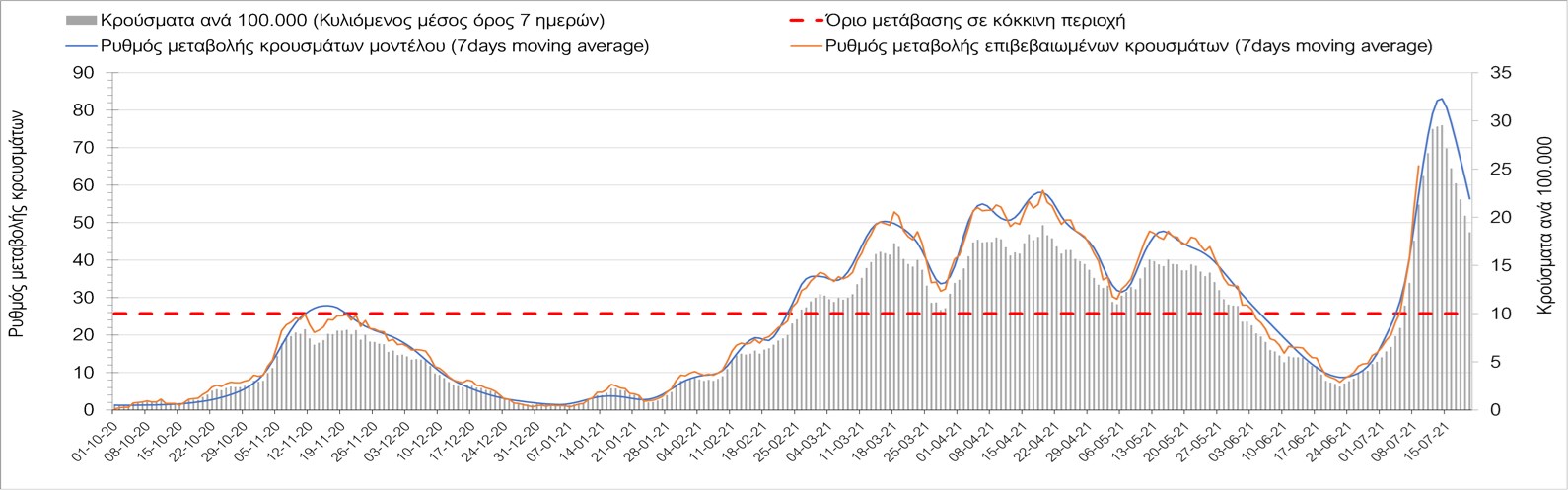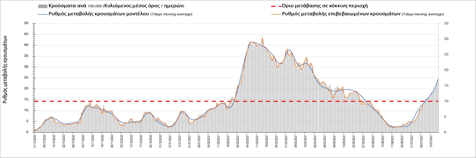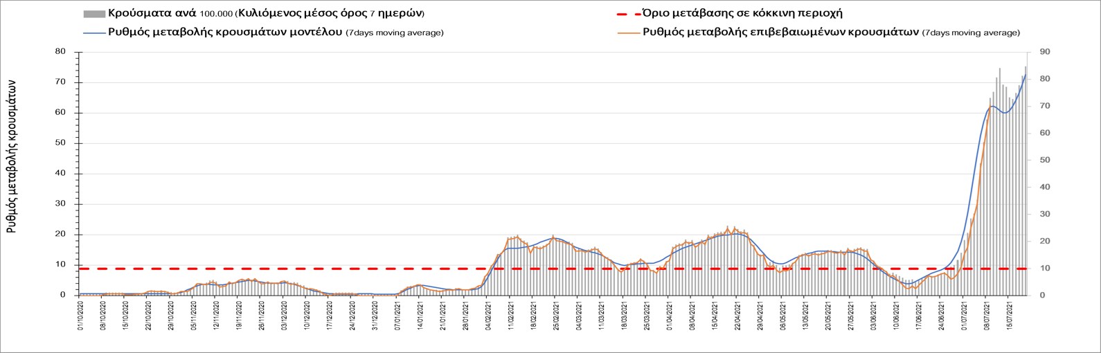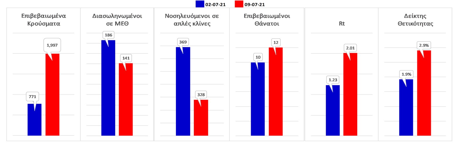 Σχήμα 53. Συγκριτικά αποτελέσματα της επιδημιολογικής εικόνας της σημερινής Παρασκευής (09/07/2021) σε σχέση με την προηγούμενη (02/07/2021) Όσον αφορά επιμέρους περιοχές, πλέον πέρα από το Ρέθυμνο, και άλλες περιοχές βρίσκονται πάνω από το όριο χαρακτηρισμού ως κόκκινες, όπως η Αθήνα, η Μαγνησία, η Ηλεία, τα Ιωάννινα, το Ηράκλειο, παρατηρούνται έντονα ανοδικές τάσεις στην Εύβοια, τη Βοιωτία, τη Λάρισα, την Καρδίτσα, την Αργολίδα, τη Μεσσηνία, την Κορινθία, την Πρέβεζα, στη Κοζάνη, τα Γρεβενά, τα Χανιά, το Λασίθι, τη Χίο και την Κέρκυρα, ενώ πιο ήπιες για την ώρα στην Αχαΐα, στην Αρκαδία, στη Φθιώτιδα, τη Χαλκιδική και τη Λέσβο. Ιδιαίτερα στην Αθήνα, προβληματίζει ο βαθμός που αυτή σχετίζεται με την εξάπλωση μεταλλαγμένων και ταχύτερα μεταδιδόμενων στελεχών (κυρίως το Β.1.1.318 και το Β.1.167). Συνεπώς, ακόμα και για περιοχές που για την ώρα είναι κάτω από το όριο (ή πολύ κοντά στο όριο), οι ανοδικές τάσεις που παρατηρούνται χρήζουν αυξημένης επιδημιολογικής επιτήρησης με εντατικοποίηση του γονιδιωματικού ελέγχου.Επίσης, σύμφωνα με τα πιο πρόσφατα στοιχεία που έγιναν διαθέσιμα, ανησυχία πλέον δημιουργεί η αύξηση του ποσοστού διασποράς του μεταλλαγμένου στελέχους Β.1.1.318 σε συγκεκριμένες περιοχές για το 15νθήμερο από 7/06/2021 έως 20/06/2021, όπου οι αντίστοιχες ποσοστώσεις είναι 33.9% για την Αττική, 12.5% για τη Δυτική Ελλάδα, 16.7% για τις Ιόνιες Νήσους και 11.11% για την Πελοπόννησο, αλλά και η εμφάνιση πλέον στη χώρα της μετάλλαξης Β.1.617 (μετάλλαξη Δέλτα). Με δεδομένα τα υπάρχοντα ανοίγματα, την παρουσία των μεταλλάξεων και την έλευση των τουριστικών ροών είναι ακόμα πιο σημαντική η τήρηση των μέτρων, με κυριότερη την ορθή και μαζική εφαρμογή των self-test, με ταυτόχρονη αύξηση της ιχνηλασίας των επαφών των ανιχνευθέντων ως θετικοί και καραντίνα 14 ημερών για τους συμπολίτες μας που θα επιβεβαιωθεί ότι είναι θετικοί στην μόλυνση με SARS-CoV-2 ακόμη και αν είναι ασυμπτωματικοί. Η σημασία και η αποτελεσματικότητα των self-test και του εμβολιασμού έχει ήδη φανεί τις προηγούμενες 8 εβδομάδες. Με δεδομένη την εμφάνιση της μετάλλαξης Β.1.617 ο πλήρης εμβολιασμός (με δύο δόσεις) του συνολικού πληθυσμού είναι σε συνδυασμό με τη μαζική και συχνή χρήση self-test οι δύο πιο αποτελεσματικές γραμμές άμυνας που έχουμε για να αντιμετωπίσουμε ΑΜΕΣΑ αυτό το πολύ πιο μεταδοτικό στέλεχος του SARS-CoV-2. Με δεδομένη την έντονη αύξηση του αριθμού των κρουσμάτων (η οποία είναι ταχύτερη του αναμενόμενου) και το γεγονός ότι είμαστε στην αρχή της τουριστικής περιόδου ακόμα, πρέπει ΑΜΕΣΑ να αυξηθεί ο αριθμός των self-test και να γίνουν όλες οι απαραίτητες ενέργειες που θα εξασφαλίσουν υψηλό αριθμό εμβολιασμένων. Σχετικά με το άνοιγμα των συνόρων σε τουριστικές ροές, αυτό θα πρέπει να συνοδευτεί με τα παρακάτω μέτρα:α) εργαστηριακός έλεγχος των ταξιδιωτών τουλάχιστον 48 ώρες πριν την αναχώρηση με δυνατότητα επανάληψης του ελέγχου 7 ημέρες από την άφιξή τους στη χώραβ) πιστοποιητικό ανάρρωσης από την Covid-19 με ημερομηνία μέχρι 6 μήνες πριν την άφιξή τους στη χώρα. γ) δυνατότητα αυξημένου αριθμού rapid test στα τουριστικά θέρετρα της χώρας και όχι μόνο στις πύλες εισόδου.Αν θέλουμε να συνδυάσουμε τη χρηστή διαχείριση του υγειονομικού κινδύνου από την COVID-19 με την εύρυθμη λειτουργία της οικονομίας και της κοινωνίας, είναι κρίσιμο να προετοιμάζουμε κατάλληλα τους χώρους εργασίας, εκπαίδευσης, τα μέσα μαζικής μεταφοράς σε επίπεδα υποδομής 