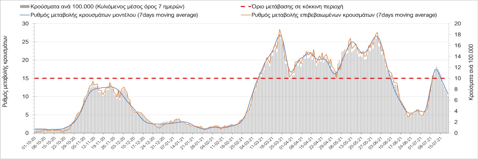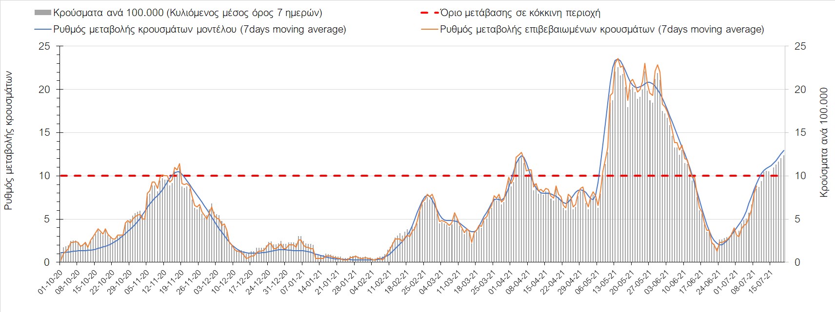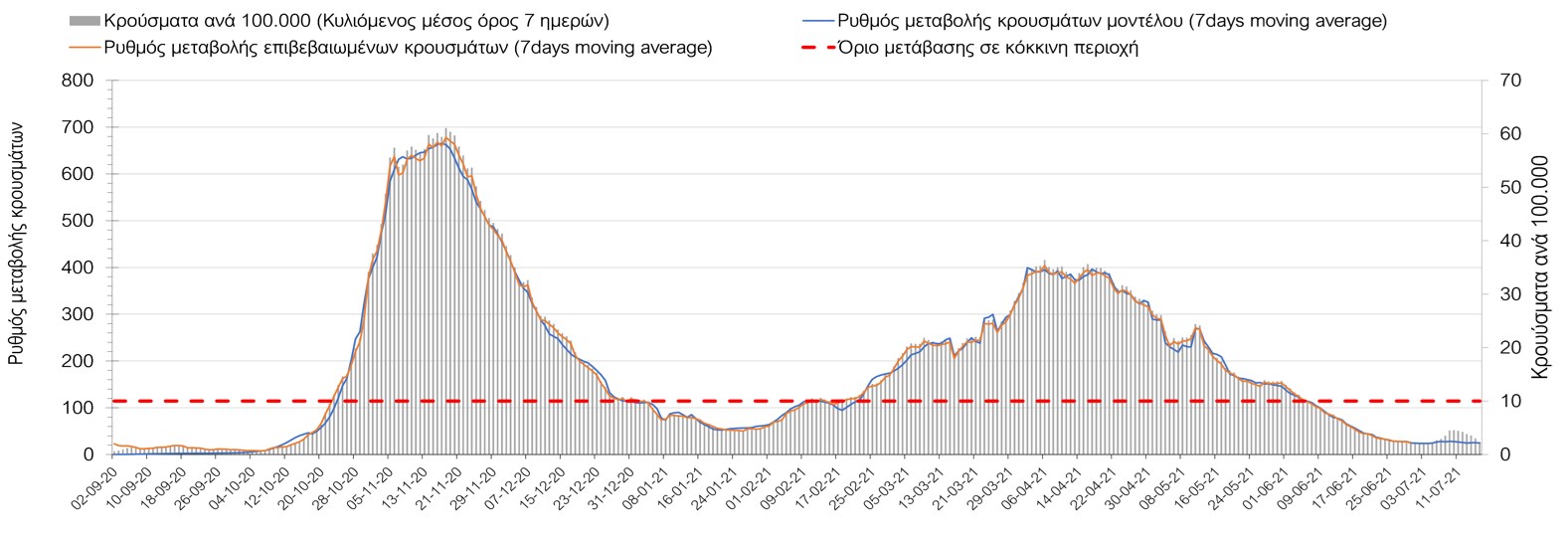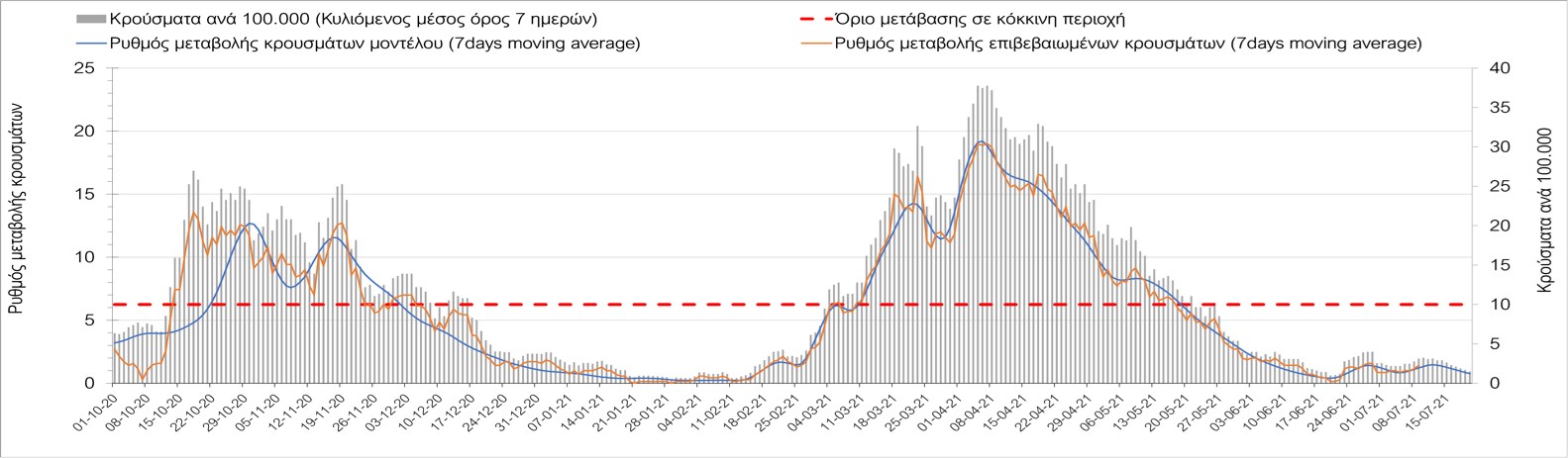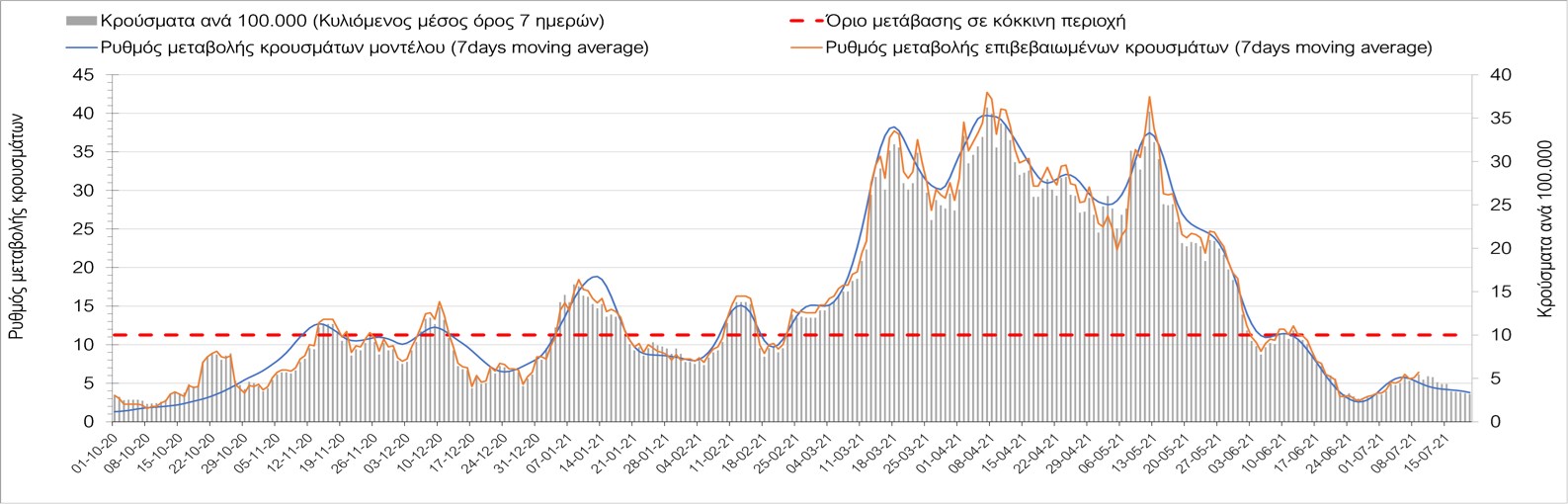 Σχήμα 53. Συγκριτικά αποτελέσματα της επιδημιολογικής εικόνας της σημερινής Παρασκευής (09/07/2021) σε σχέση με την προηγούμενη (02/07/2021) Όσον αφορά επιμέρους περιοχές, πλέον πέρα από το Ρέθυμνο, και άλλες περιοχές βρίσκονται πάνω από το όριο χαρακτηρισμού ως κόκκινες, όπως η Αθήνα, η Μαγνησία, η Ηλεία, τα Ιωάννινα, το Ηράκλειο, παρατηρούνται έντονα ανοδικές τάσεις στην Εύβοια, τη Βοιωτία, τη Λάρισα, την Καρδίτσα, την Αργολίδα, τη Μεσσηνία, την Κορινθία, την Πρέβεζα, στη Κοζάνη, τα Γρεβενά, τα Χανιά, το Λασίθι, τη Χίο και την Κέρκυρα, ενώ πιο ήπιες για την ώρα στην Αχαΐα, στην Αρκαδία, στη Φθιώτιδα, τη Χαλκιδική και τη Λέσβο. Ιδιαίτερα στην Αθήνα, προβληματίζει ο βαθμός που αυτή σχετίζεται με την εξάπλωση μεταλλαγμένων και ταχύτερα μεταδιδόμενων στελεχών (κυρίως το Β.1.1.318 και το Β.1.167). Συνεπώς, ακόμα και για περιοχές που για την ώρα είναι κάτω από το όριο (ή πολύ κοντά στο όριο), οι ανοδικές τάσεις που παρατηρούνται χρήζουν αυξημένης επιδημιολογικής επιτήρησης με εντατικοποίηση του γονιδιωματικού ελέγχου.Επίσης, σύμφωνα με τα πιο πρόσφατα στοιχεία που έγιναν διαθέσιμα, ανησυχία πλέον δημιουργεί η αύξηση του ποσοστού διασποράς του μεταλλαγμένου στελέχους Β.1.1.318 σε συγκεκριμένες περιοχές για το 15νθήμερο από 7/06/2021 έως 20/06/2021, όπου οι αντίστοιχες ποσοστώσεις είναι 33.9% για την Αττική, 12.5% για τη Δυτική Ελλάδα, 16.7% για τις Ιόνιες Νήσους και 11.11% για την Πελοπόννησο, αλλά και η εμφάνιση πλέον στη χώρα της μετάλλαξης Β.1.617 (μετάλλαξη Δέλτα). Με δεδομένα τα υπάρχοντα ανοίγματα, την παρουσία των μεταλλάξεων και την έλευση των τουριστικών ροών είναι ακόμα πιο σημαντική η τήρηση των μέτρων, με κυριότερη την ορθή και μαζική εφαρμογή των self-test, με ταυτόχρονη αύξηση της ιχνηλασίας των επαφών των ανιχνευθέντων ως θετικοί και καραντίνα 14 ημερών για τους συμπολίτες μας που θα επιβεβαιωθεί ότι είναι θετικοί στην μόλυνση με SARS-CoV-2 ακόμη και αν είναι ασυμπτωματικοί. Η σημασία και η αποτελεσματικότητα των self-test και του εμβολιασμού έχει ήδη φανεί τις προηγούμενες 8 εβδομάδες. Με δεδομένη την εμφάνιση της μετάλλαξης Β.1.617 ο πλήρης εμβολιασμός (με δύο δόσεις) του συνολικού πληθυσμού είναι σε συνδυασμό με τη μαζική και συχνή χρήση self-test οι δύο πιο αποτελεσματικές γραμμές άμυνας που έχουμε για να αντιμετωπίσουμε ΑΜΕΣΑ αυτό το πολύ πιο μεταδοτικό στέλεχος του SARS-CoV-2. Με δεδομένη την έντονη αύξηση του αριθμού των κρουσμάτων (η οποία είναι ταχύτερη του αναμενόμενου) και το γεγονός ότι είμαστε στην αρχή της τουριστικής περιόδου ακόμα, πρέπει ΑΜΕΣΑ να αυξηθεί ο αριθμός των self-test και να γίνουν όλες οι απαραίτητες ενέργειες που θα εξασφαλίσουν υψηλό αριθμό εμβολιασμένων. Σχετικά με το άνοιγμα των συνόρων σε τουριστικές ροές, αυτό θα πρέπει να συνοδευτεί με τα παρακάτω μέτρα:α) εργαστηριακός έλεγχος των ταξιδιωτών τουλάχιστον 48 ώρες πριν την αναχώρηση με δυνατότητα επανάληψης του ελέγχου 7 ημέρες από την άφιξή τους στη χώραβ) πιστοποιητικό ανάρρωσης από την Covid-19 με ημερομηνία μέχρι 6 μήνες πριν την άφιξή τους στη χώρα. γ) δυνατότητα αυξημένου αριθμού rapid test στα τουριστικά θέρετρα της χώρας και όχι μόνο στις πύλες εισόδου.Αν θέλουμε να συνδυάσουμε τη χρηστή διαχείριση του υγειονομικού κινδύνου από την COVID-19 με την εύρυθμη λειτουργία της οικονομίας και της κοινωνίας, είναι κρίσιμο να προετοιμάζουμε κατάλληλα τους χώρους εργασίας, εκπαίδευσης, τα μέσα μαζικής μεταφοράς σε επίπεδα υποδομής 