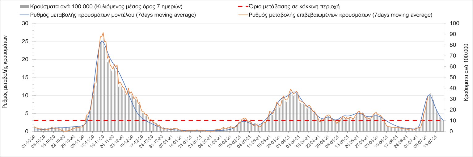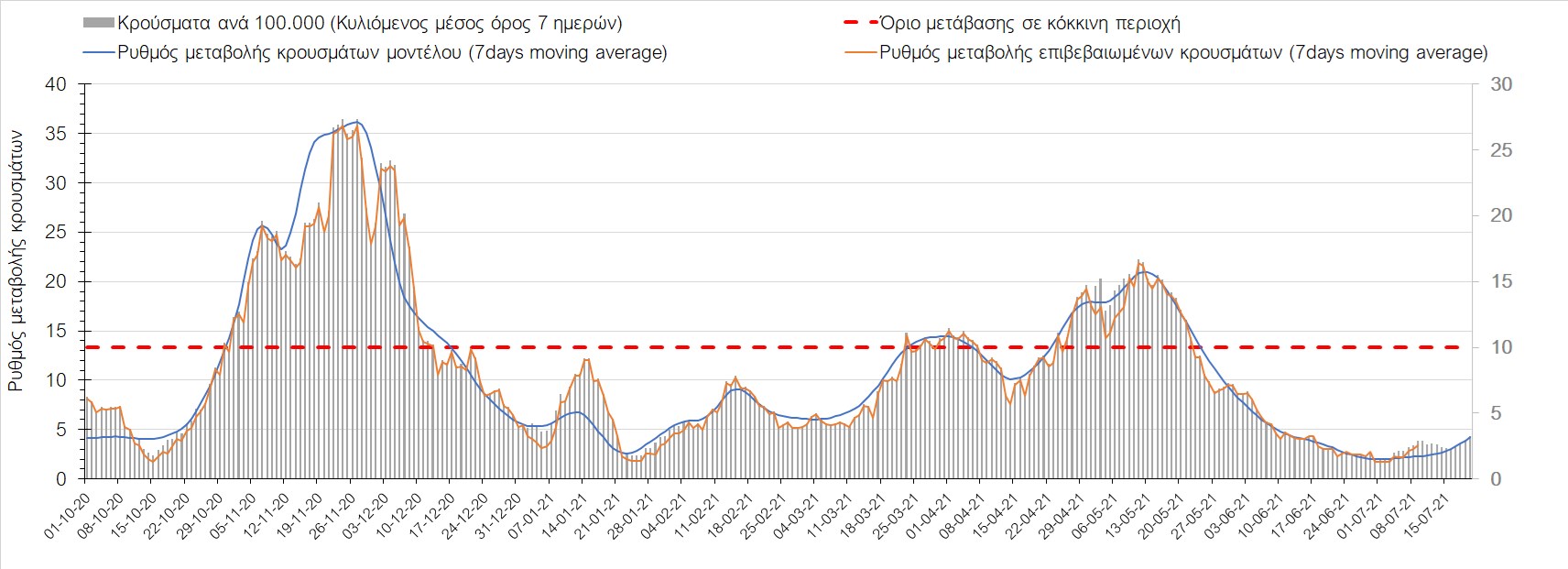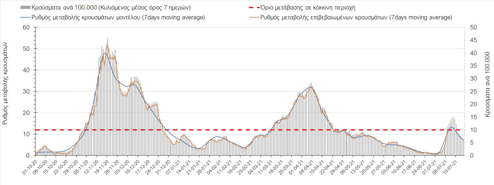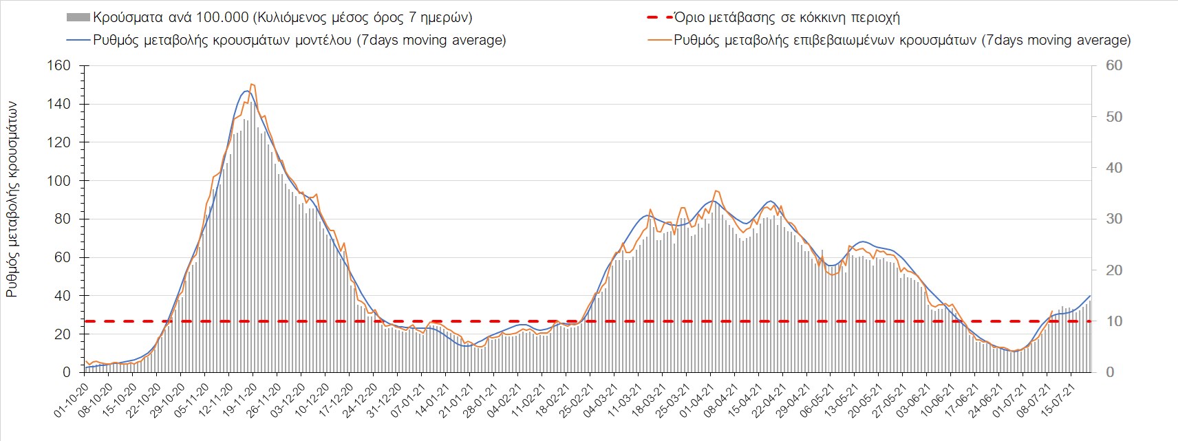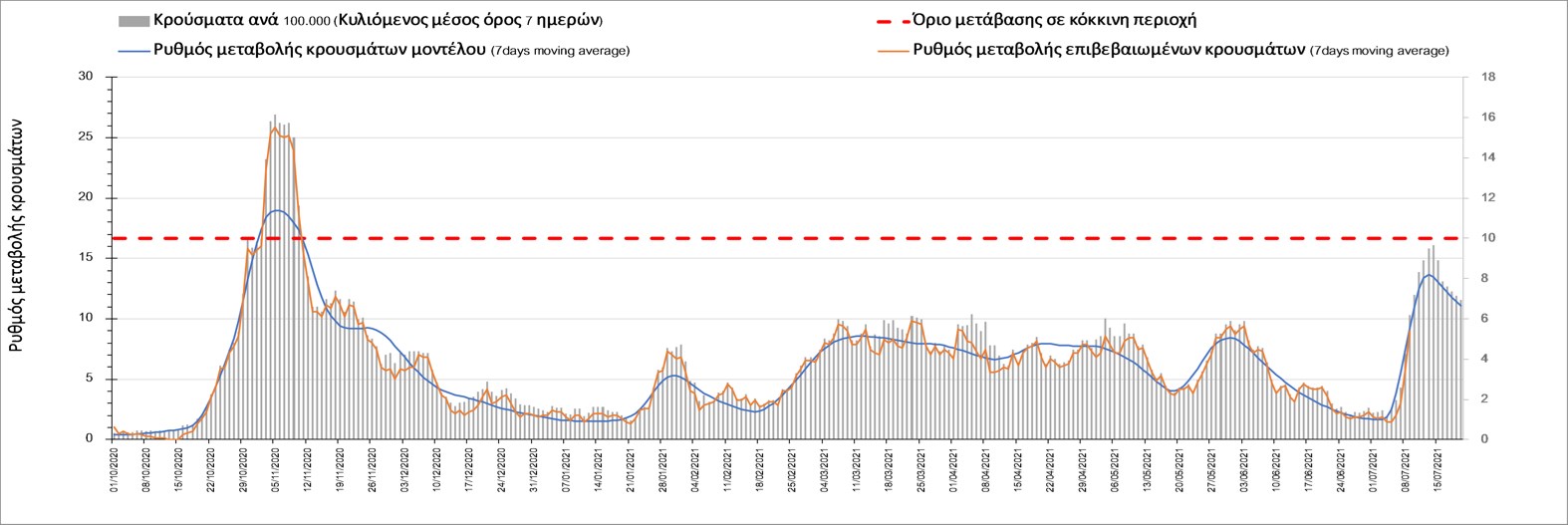 Σχήμα 53. Συγκριτικά αποτελέσματα της επιδημιολογικής εικόνας της σημερινής Παρασκευής (09/07/2021) σε σχέση με την προηγούμενη (02/07/2021) Όσον αφορά επιμέρους περιοχές, πλέον πέρα από το Ρέθυμνο, και άλλες περιοχές βρίσκονται πάνω από το όριο χαρακτηρισμού ως κόκκινες, όπως η Αθήνα, η Μαγνησία, η Ηλεία, τα Ιωάννινα, το Ηράκλειο, παρατηρούνται έντονα ανοδικές τάσεις στην Εύβοια, τη Βοιωτία, τη Λάρισα, την Καρδίτσα, την Αργολίδα, τη Μεσσηνία, την Κορινθία, την Πρέβεζα, στη Κοζάνη, τα Γρεβενά, τα Χανιά, το Λασίθι, τη Χίο και την Κέρκυρα, ενώ πιο ήπιες για την ώρα στην Αχαΐα, στην Αρκαδία, στη Φθιώτιδα, τη Χαλκιδική και τη Λέσβο. Ιδιαίτερα στην Αθήνα, προβληματίζει ο βαθμός που αυτή σχετίζεται με την εξάπλωση μεταλλαγμένων και ταχύτερα μεταδιδόμενων στελεχών (κυρίως το Β.1.1.318 και το Β.1.167). Συνεπώς, ακόμα και για περιοχές που για την ώρα είναι κάτω από το όριο (ή πολύ κοντά στο όριο), οι ανοδικές τάσεις που παρατηρούνται χρήζουν αυξημένης επιδημιολογικής επιτήρησης με εντατικοποίηση του γονιδιωματικού ελέγχου.Επίσης, σύμφωνα με τα πιο πρόσφατα στοιχεία που έγιναν διαθέσιμα, ανησυχία πλέον δημιουργεί η αύξηση του ποσοστού διασποράς του μεταλλαγμένου στελέχους Β.1.1.318 σε συγκεκριμένες περιοχές για το 15νθήμερο από 7/06/2021 έως 20/06/2021, όπου οι αντίστοιχες ποσοστώσεις είναι 33.9% για την Αττική, 12.5% για τη Δυτική Ελλάδα, 16.7% για τις Ιόνιες Νήσους και 11.11% για την Πελοπόννησο, αλλά και η εμφάνιση πλέον στη χώρα της μετάλλαξης Β.1.617 (μετάλλαξη Δέλτα). Με δεδομένα τα υπάρχοντα ανοίγματα, την παρουσία των μεταλλάξεων και την έλευση των τουριστικών ροών είναι ακόμα πιο σημαντική η τήρηση των μέτρων, με κυριότερη την ορθή και μαζική εφαρμογή των self-test, με ταυτόχρονη αύξηση της ιχνηλασίας των επαφών των ανιχνευθέντων ως θετικοί και καραντίνα 14 ημερών για τους συμπολίτες μας που θα επιβεβαιωθεί ότι είναι θετικοί στην μόλυνση με SARS-CoV-2 ακόμη και αν είναι ασυμπτωματικοί. Η σημασία και η αποτελεσματικότητα των self-test και του εμβολιασμού έχει ήδη φανεί τις προηγούμενες 8 εβδομάδες. Με δεδομένη την εμφάνιση της μετάλλαξης Β.1.617 ο πλήρης εμβολιασμός (με δύο δόσεις) του συνολικού πληθυσμού είναι σε συνδυασμό με τη μαζική και συχνή χρήση self-test οι δύο πιο αποτελεσματικές γραμμές άμυνας που έχουμε για να αντιμετωπίσουμε ΑΜΕΣΑ αυτό το πολύ πιο μεταδοτικό στέλεχος του SARS-CoV-2. Με δεδομένη την έντονη αύξηση του αριθμού των κρουσμάτων (η οποία είναι ταχύτερη του αναμενόμενου) και το γεγονός ότι είμαστε στην αρχή της τουριστικής περιόδου ακόμα, πρέπει ΑΜΕΣΑ να αυξηθεί ο αριθμός των self-test και να γίνουν όλες οι απαραίτητες ενέργειες που θα εξασφαλίσουν υψηλό αριθμό εμβολιασμένων. Σχετικά με το άνοιγμα των συνόρων σε τουριστικές ροές, αυτό θα πρέπει να συνοδευτεί με τα παρακάτω μέτρα:α) εργαστηριακός έλεγχος των ταξιδιωτών τουλάχιστον 48 ώρες πριν την αναχώρηση με δυνατότητα επανάληψης του ελέγχου 7 ημέρες από την άφιξή τους στη χώραβ) πιστοποιητικό ανάρρωσης από την Covid-19 με ημερομηνία μέχρι 6 μήνες πριν την άφιξή τους στη χώρα. γ) δυνατότητα αυξημένου αριθμού rapid test στα τουριστικά θέρετρα της χώρας και όχι μόνο στις πύλες εισόδου.Αν θέλουμε να συνδυάσουμε τη χρηστή διαχείριση του υγειονομικού κινδύνου από την COVID-19 με την εύρυθμη λειτουργία της οικονομίας και της κοινωνίας, είναι κρίσιμο να προετοιμάζουμε κατάλληλα τους χώρους εργασίας, εκπαίδευσης, τα μέσα μαζικής μεταφοράς σε επίπεδα υποδομής 