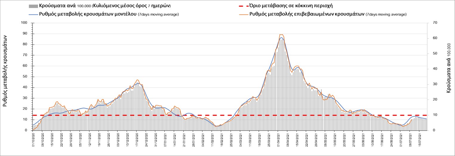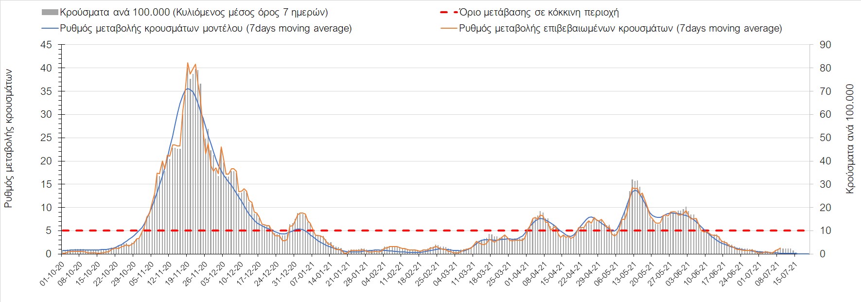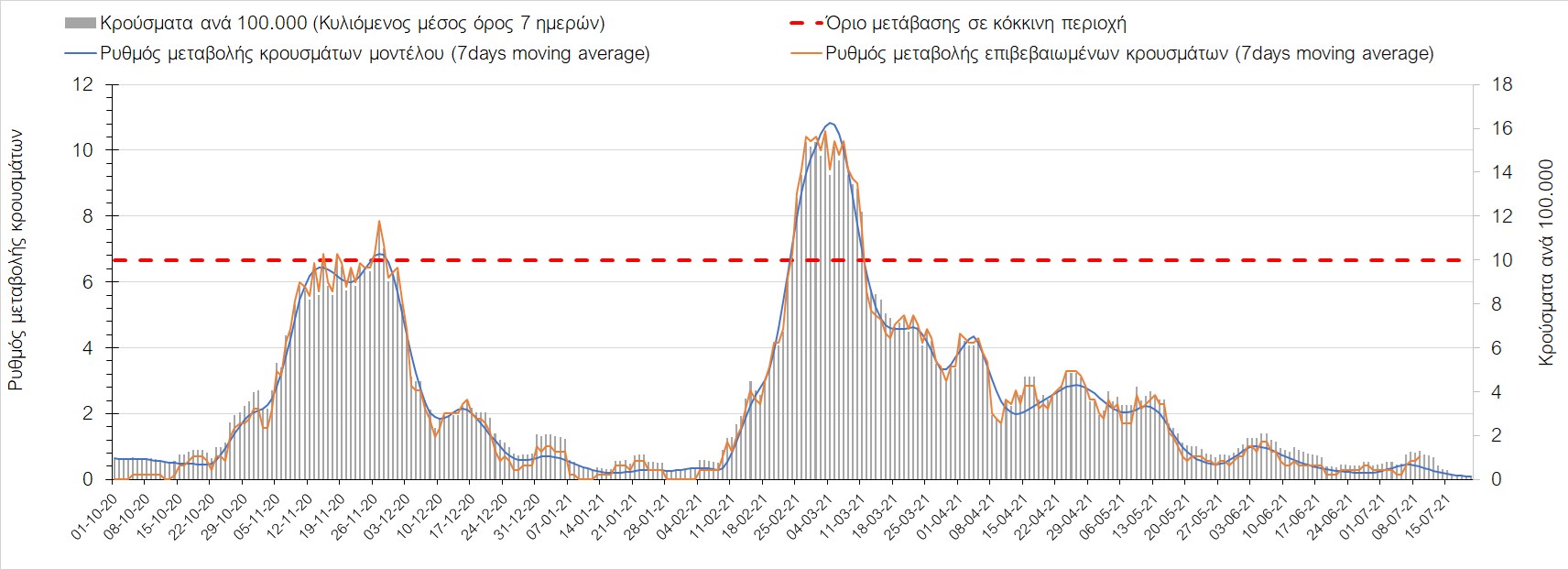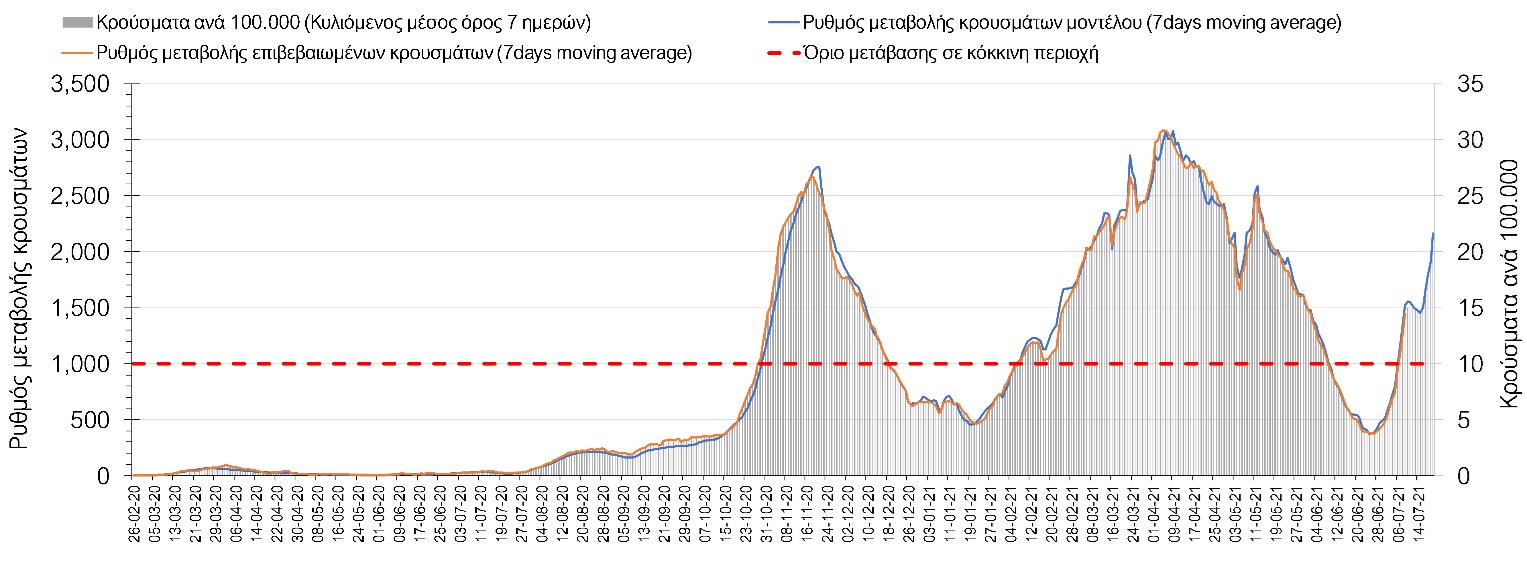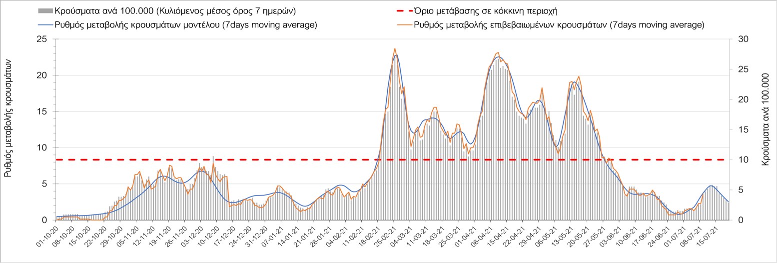 Σχήμα 53. Συγκριτικά αποτελέσματα της επιδημιολογικής εικόνας της σημερινής Παρασκευής (09/07/2021) σε σχέση με την προηγούμενη (02/07/2021) Όσον αφορά επιμέρους περιοχές, πλέον πέρα από το Ρέθυμνο, και άλλες περιοχές βρίσκονται πάνω από το όριο χαρακτηρισμού ως κόκκινες, όπως η Αθήνα, η Μαγνησία, η Ηλεία, τα Ιωάννινα, το Ηράκλειο, παρατηρούνται έντονα ανοδικές τάσεις στην Εύβοια, τη Βοιωτία, τη Λάρισα, την Καρδίτσα, την Αργολίδα, τη Μεσσηνία, την Κορινθία, την Πρέβεζα, στη Κοζάνη, τα Γρεβενά, τα Χανιά, το Λασίθι, τη Χίο και την Κέρκυρα, ενώ πιο ήπιες για την ώρα στην Αχαΐα, στην Αρκαδία, στη Φθιώτιδα, τη Χαλκιδική και τη Λέσβο. Ιδιαίτερα στην Αθήνα, προβληματίζει ο βαθμός που αυτή σχετίζεται με την εξάπλωση μεταλλαγμένων και ταχύτερα μεταδιδόμενων στελεχών (κυρίως το Β.1.1.318 και το Β.1.167). Συνεπώς, ακόμα και για περιοχές που για την ώρα είναι κάτω από το όριο (ή πολύ κοντά στο όριο), οι ανοδικές τάσεις που παρατηρούνται χρήζουν αυξημένης επιδημιολογικής επιτήρησης με εντατικοποίηση του γονιδιωματικού ελέγχου.Επίσης, σύμφωνα με τα πιο πρόσφατα στοιχεία που έγιναν διαθέσιμα, ανησυχία πλέον δημιουργεί η αύξηση του ποσοστού διασποράς του μεταλλαγμένου στελέχους Β.1.1.318 σε συγκεκριμένες περιοχές για το 15νθήμερο από 7/06/2021 έως 20/06/2021, όπου οι αντίστοιχες ποσοστώσεις είναι 33.9% για την Αττική, 12.5% για τη Δυτική Ελλάδα, 16.7% για τις Ιόνιες Νήσους και 11.11% για την Πελοπόννησο, αλλά και η εμφάνιση πλέον στη χώρα της μετάλλαξης Β.1.617 (μετάλλαξη Δέλτα). Με δεδομένα τα υπάρχοντα ανοίγματα, την παρουσία των μεταλλάξεων και την έλευση των τουριστικών ροών είναι ακόμα πιο σημαντική η τήρηση των μέτρων, με κυριότερη την ορθή και μαζική εφαρμογή των self-test, με ταυτόχρονη αύξηση της ιχνηλασίας των επαφών των ανιχνευθέντων ως θετικοί και καραντίνα 14 ημερών για τους συμπολίτες μας που θα επιβεβαιωθεί ότι είναι θετικοί στην μόλυνση με SARS-CoV-2 ακόμη και αν είναι ασυμπτωματικοί. Η σημασία και η αποτελεσματικότητα των self-test και του εμβολιασμού έχει ήδη φανεί τις προηγούμενες 8 εβδομάδες. Με δεδομένη την εμφάνιση της μετάλλαξης Β.1.617 ο πλήρης εμβολιασμός (με δύο δόσεις) του συνολικού πληθυσμού είναι σε συνδυασμό με τη μαζική και συχνή χρήση self-test οι δύο πιο αποτελεσματικές γραμμές άμυνας που έχουμε για να αντιμετωπίσουμε ΑΜΕΣΑ αυτό το πολύ πιο μεταδοτικό στέλεχος του SARS-CoV-2. Με δεδομένη την έντονη αύξηση του αριθμού των κρουσμάτων (η οποία είναι ταχύτερη του αναμενόμενου) και το γεγονός ότι είμαστε στην αρχή της τουριστικής περιόδου ακόμα, πρέπει ΑΜΕΣΑ να αυξηθεί ο αριθμός των self-test και να γίνουν όλες οι απαραίτητες ενέργειες που θα εξασφαλίσουν υψηλό αριθμό εμβολιασμένων. Σχετικά με το άνοιγμα των συνόρων σε τουριστικές ροές, αυτό θα πρέπει να συνοδευτεί με τα παρακάτω μέτρα:α) εργαστηριακός έλεγχος των ταξιδιωτών τουλάχιστον 48 ώρες πριν την αναχώρηση με δυνατότητα επανάληψης του ελέγχου 7 ημέρες από την άφιξή τους στη χώραβ) πιστοποιητικό ανάρρωσης από την Covid-19 με ημερομηνία μέχρι 6 μήνες πριν την άφιξή τους στη χώρα. γ) δυνατότητα αυξημένου αριθμού rapid test στα τουριστικά θέρετρα της χώρας και όχι μόνο στις πύλες εισόδου.Αν θέλουμε να συνδυάσουμε τη χρηστή διαχείριση του υγειονομικού κινδύνου από την COVID-19 με την εύρυθμη λειτουργία της οικονομίας και της κοινωνίας, είναι κρίσιμο να προετοιμάζουμε κατάλληλα τους χώρους εργασίας, εκπαίδευσης, τα μέσα μαζικής μεταφοράς σε επίπεδα υποδομής 