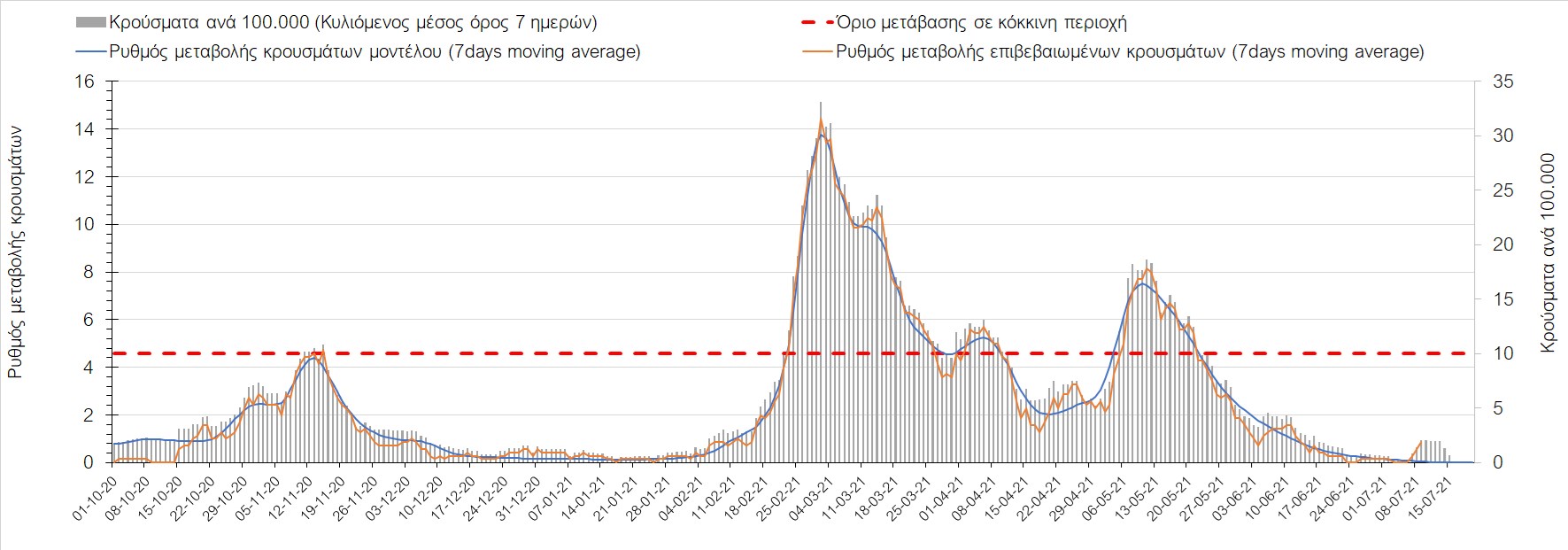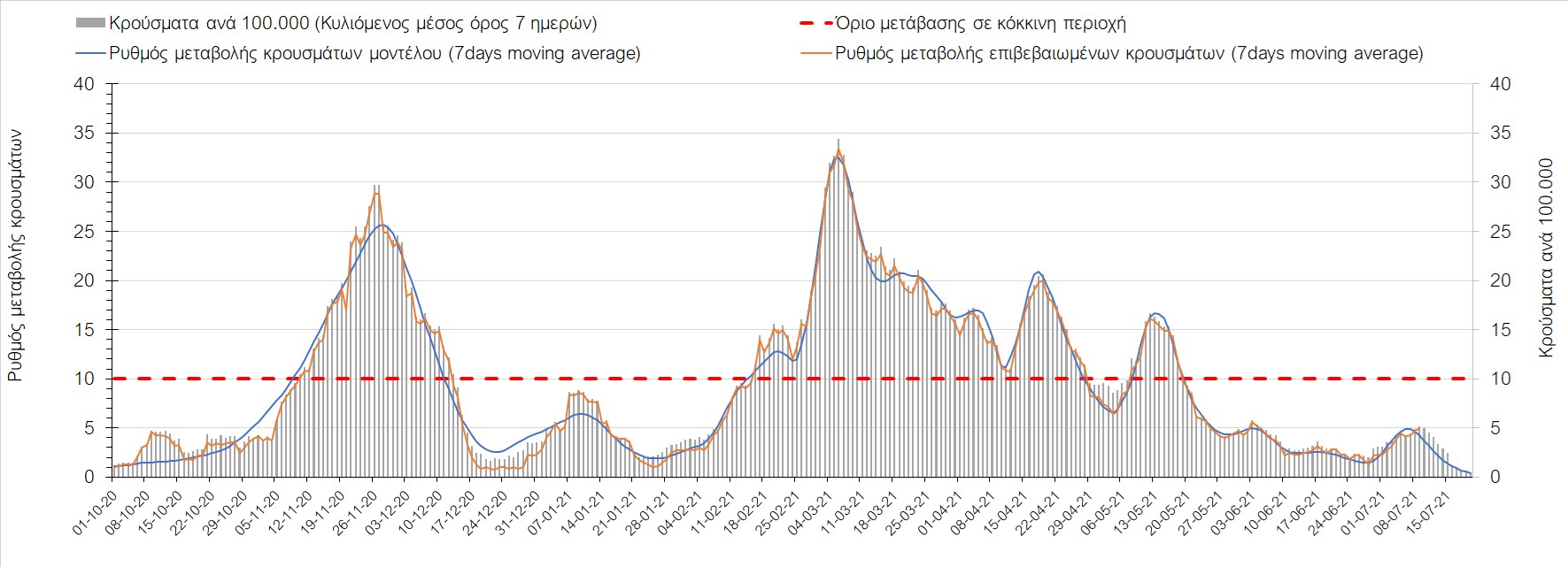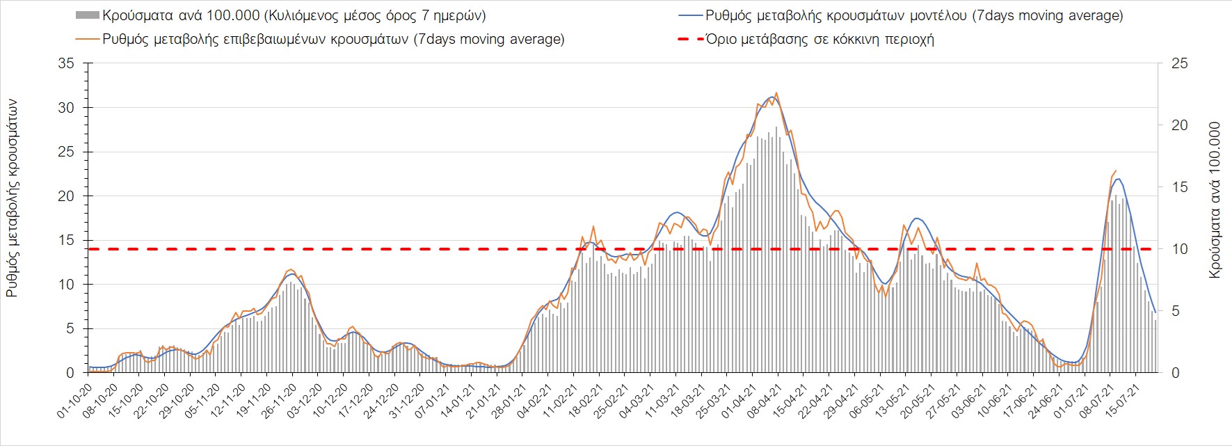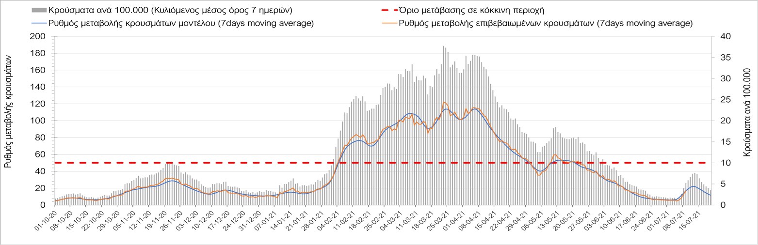 Σχήμα 52. Πορεία του ημερησίου αριθμού των κρουσμάτων (κυλιόμενος μέσος όρος 7 ημερών) στην Θάσο Συμπεράσματα:Με βάση τα αποτελέσματα, την Παρασκευή είχαμε μικρότερο αριθμό ασθενών σε κρίσιμη κατάσταση (διασωληνωμένοι σε ΜΕΘ) σε σχέση με προχθές, και συνολικά συνεχίζεται η πορεία αποκλιμάκωσης τους (με μικρότερο ρυθμό πλέον), ενώ πλέον οι θάνατοι παρουσιάζουν σταθεροποίηση. Οι προβλέψεις αυτές συνάδουν με τις προσομοιώσεις του μοντέλου CORE, όπως και ο αριθμός των κρουσμάτων, ο οποίος παρουσιάζει αυξητικές τάσεις για το σύνολο της χώρας. Σε πανελλαδικό επίπεδο ο κυλιόμενος εβδομαδιαίος μέσος όρος του δείκτη θετικότητας διαμορφώθηκε στο 2,8% (η ημερήσια τιμή είναι 2,9%) ενώ ο κυλιόμενος εβδομαδιαίος μέσος όρος του πραγματικού αριθμού αναπαραγωγής Rt (δηλαδή ο αριθμός των ατόμων που ένας φορέας μπορεί να επιμολύνει) διαμορφώθηκε στο 2,01(τιμές του Rt πάνω από τη μονάδα υποδηλώνουν αύξηση της διασποράς του ιού στην κοινότητα). Συνολικά η πορεία της πανδημίας ενώ ήταν πολύ καλή μέχρι και πριν 2 εβδομάδες, πλέον έχει μετασχηματιστεί σε έντονα ανοδική, η οποία κάθε μέρα ισχυροποιείται, όπως αντικατοπτρίζεται και από τον ημερήσιο αριθμό των κρουσμάτων (κυλιόμενος μέσος όρος 7 ημερών) που έφτασε στα 1449. Η πορεία της πανδημίας από την προηγούμενη Τρίτη είναι ανοδική (κυρίως οφειλόμενη στη σημαντική αύξηση στην Αττική, αλλά πλέον και σε άλλες επαρχιακές πόλεις), όπως υποδηλώνει και η αύξηση του Rt κατά 0.12 ανά ημέρα τις προηγούμενες 7 ημέρες). Δυστυχώς πλέον, η μεγαλύτερη από τη φαινομενική διασπορά των μεταλλάξεων και τα υπάρχοντα ανοίγματα, έχουν ξεπεράσει τη δυναμική μείωσης της διασποράς λόγω της ανόδου της θερμοκρασίας και της επαγόμενης πτώσης της μεταδοτικότητας, του μεγάλου αριθμού των self-test (που όμως είναι λίγο μικρότερος σε σχέση με τις πρώτες εβδομάδες) και της προόδου των εμβολιασμών. Η επιδημιολογική εικόνα χθες σε σχέση με την προηγούμενη Παρασκευή, παρουσιάζεται στα συγκριτικά συγκεντρωτικά αποτελέσματα στο Σχήμα 53. Είναι χαρακτηριστική η άνοδος της εβδομαδιαίας μέσης τιμής του Rt από 1.23 την προηγούμενη Παρασκευή σε σχέση με 2.01 σήμερα. Αξίζει να σημειωθεί ότι η τιμή αυτή του Rt είναι ιδιαίτερα υψηλή για την εποχή, και δε δικαιολογείται μόνο από την παρουσία μεταλλάξεων, αλλά συνδέεται και με φαινόμενα συρροής τα οποία παρατηρούνται κυρίως στην Αττική. Επειδή όμως πολύ έντονες αυξητικές τάσεις παρατηρούνται επιλεκτικά και σε άλλες περιοχές της Ελλάδας, χρειάζεται περαιτέρω διερεύνηση εάν η πολύ έντονη κατά τόπους αύξηση, συνδέεται με την παρουσία των ταχύτερα μεταδιδόμενων στελεχών, με φαινόμενα συρροής, ή με συνδυασμό αυτών, που είναι και το πιθανότερο. Στην πράξη δηλαδή, λόγω της αυξημένης μεταδοτικότητας των νέων στελεχών, τα φαινόμενα συρροής αποδεικνύονται πολύ πιο επιβαρυντικά για τη διασπορά της νόσου στην κοινότητα. Αυτό πρέπει να το έχουμε κατά νου για τη συνέχεια του καλοκαιριού και τη διαχείριση θρησκευτικών και άλλων παραδοσιακών εκδηλώσεων όπου συμβαίνουν φαινόμενα συρροής.