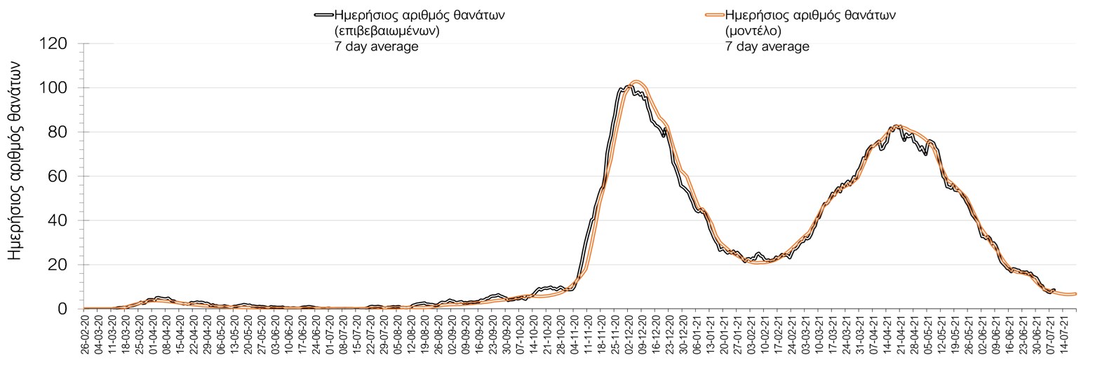 Σχήμα 3. Αριθμός θανάτων (κυλιόμενος μέσος όρος 7 ημερών) σύμφωνα με τα στοιχεία του ΕΟΔΥ και τις προβλέψεις της υπολογιστικής πλατφόρμας CORE.Η πορεία της μέσης εβδομαδιαίας τιμής των κρουσμάτων, καθώς και του κυλιόμενου μέσου όρου 7 ημερών του αριθμού των κρουσμάτων ανά 100.000 πληθυσμού, όπως έχουν καταγραφεί από τον ΕΟΔΥ και η αναμενόμενη πορεία τους όπως προδιαγράφεται από την υπολογιστική πλατφόρμα CORE για την Ελληνική επικράτεια μέχρι τις 15 Ιουλίου, αποτυπώνονται στο Σχήμα 4. Αυτή η προβλεπόμενη πορεία, που αφορά τα κρούσματα, τους νοσηλευόμενους σε απλές κλίνες, όσο και σε ΜΕΘ, καθώς επίσης και τους θανάτους, βασίζεται στις ακόλουθες παραδοχές: