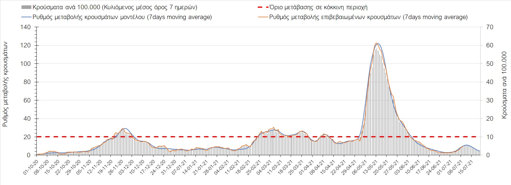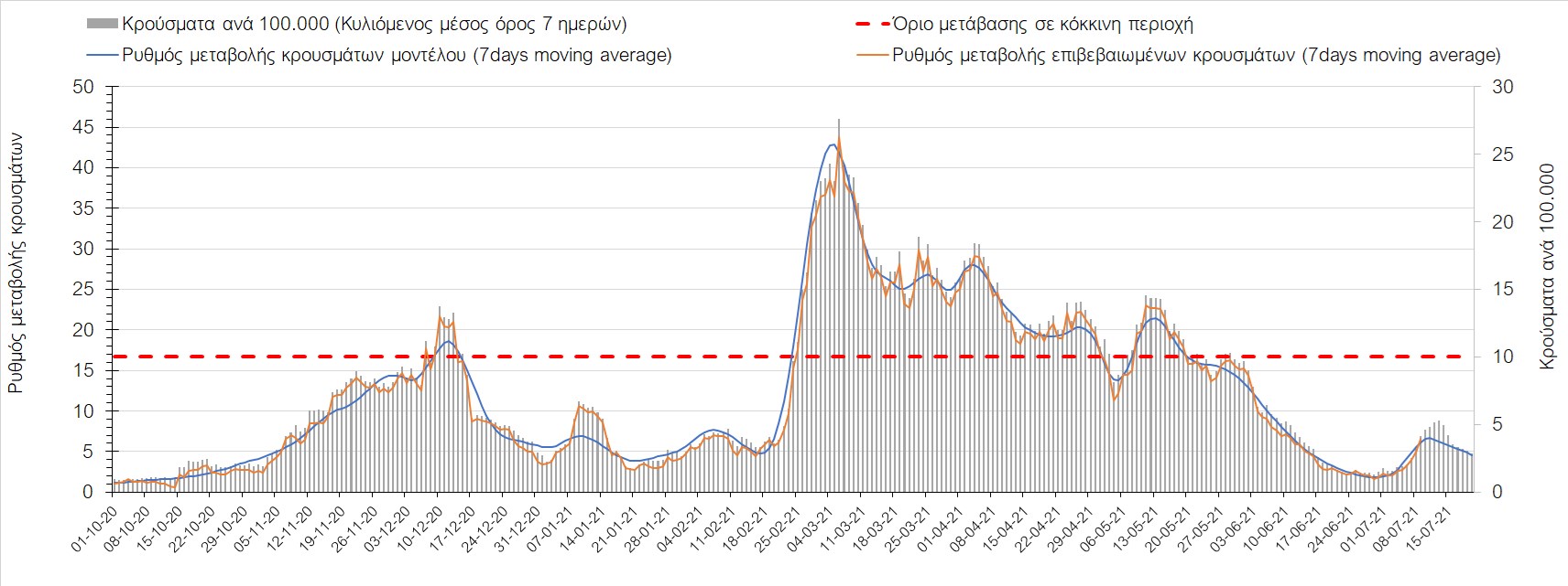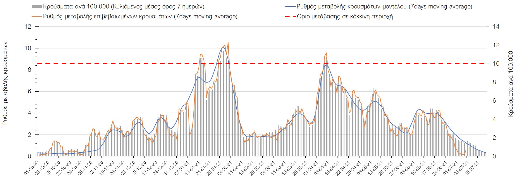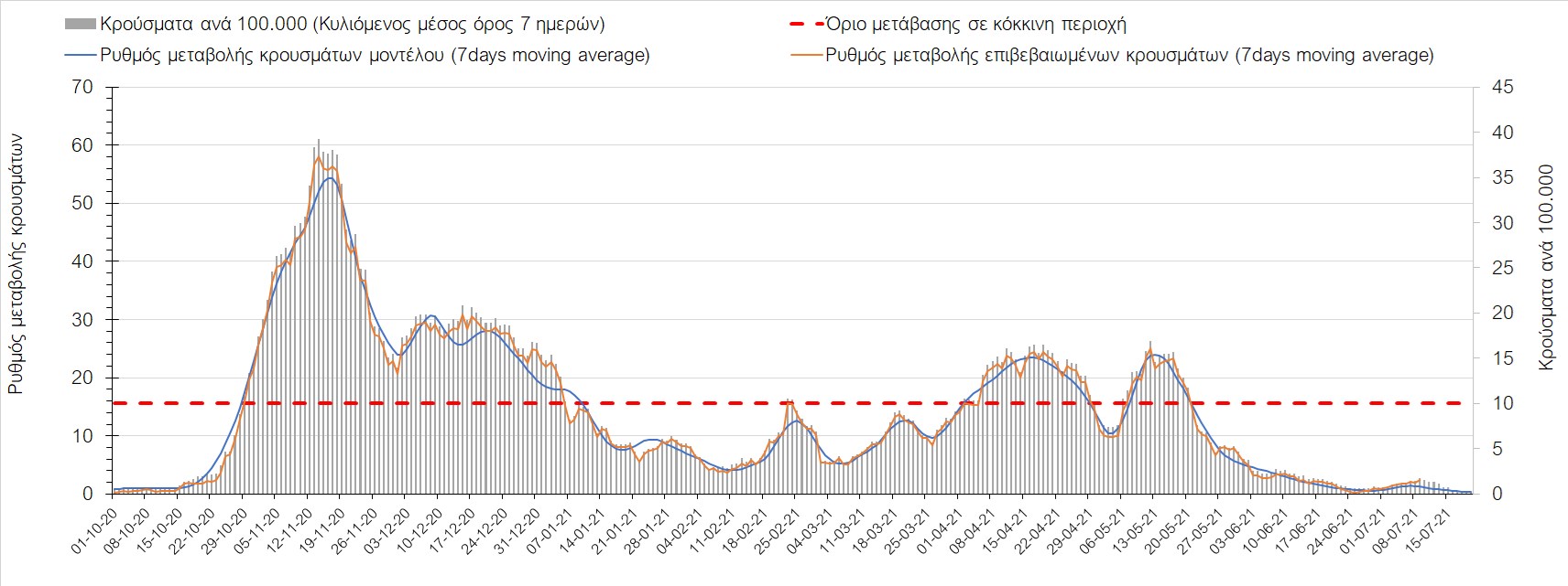 Σχήμα 44. Πορεία του ημερησίου αριθμού των κρουσμάτων (κυλιόμενος μέσος όρος 7 ημερών) στον ΈβροΣτο Ηράκλειο, όπου εντοπίστηκαν 106 κρούσματα παρατηρείται μικρότερος αριθμός σε σχέση με προχθές και παρατηρείται πλέον διαμόρφωση ενός νέου ανοδικού κύματος, το οποίο ήδη ξεπέρασε σε ύψος το μέγιστο του 3ου κύματος, που πιθανότατα οφείλεται στο σχετικά μεγάλο αριθμό κρουσμάτων που φέρουν το μεταλλαγμένο στέλεχος Δ (Σχήμα 45). Στα Χανιά με 31 κρούσματα (Σχήμα 46) έχουμε αυξημένο αριθμό κρουσμάτων σε σχέση με προχθές και πλέον και εδώ αρχίζει να διαμορφώνεται ανοδική πορεία, η οποία έφερα τα Χανιά ελάχιστα πάνω από το όριο χαρακτηρισμού ως κόκκινη περιοχή. Μειωμένος αριθμός κρουσμάτων παρατηρείται στο Ρέθυμνο με 73 κρούσματα, όπου παρατηρείται ένα πολύ έντονα ανοδικό κύμα (Σχήμα 47), το οποίο είναι ήδη πολύ ψηλότερο από το 3ο κύμα. Στο Λασίθι παρατηρείται μεγαλύτερος αριθμός κρουσμάτων σχέση με προχθές, καθώς εντοπίστηκαν 16 κρούσματα (Σχήμα 48), με αποτέλεσμα και σε αυτήν την περιοχή να έχει διαμορφωθεί πολύ έντονα ανοδική τάση.