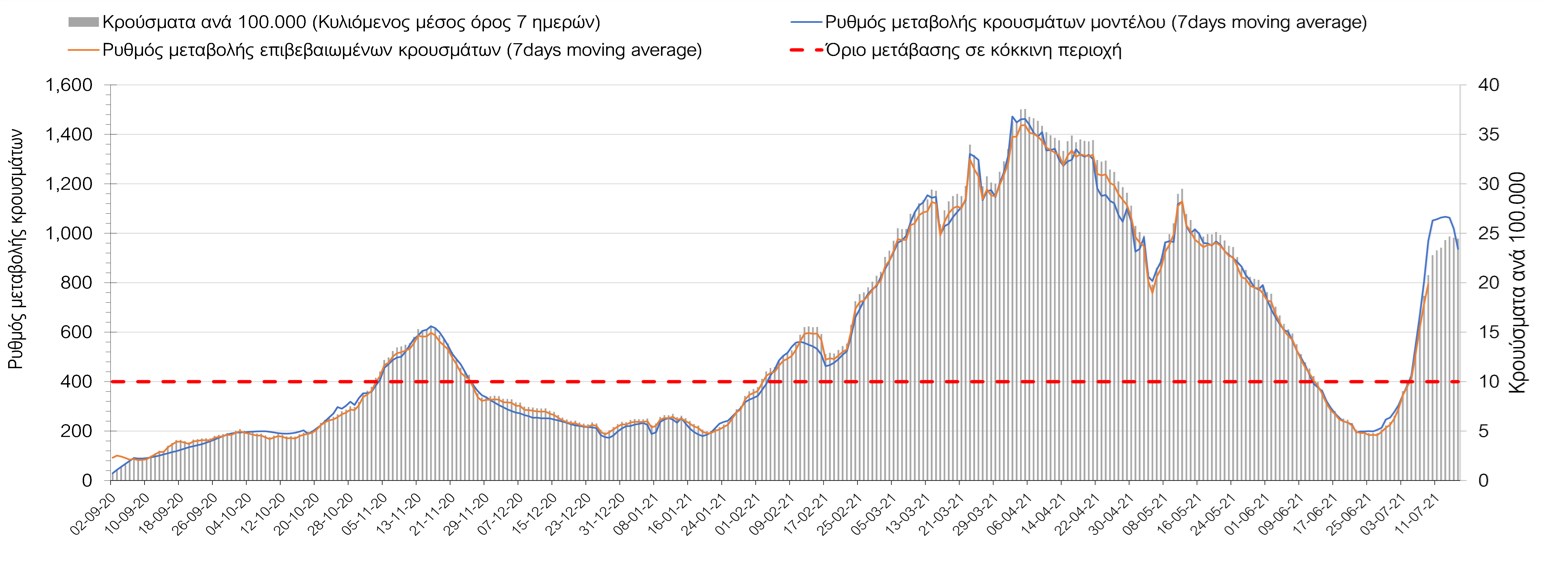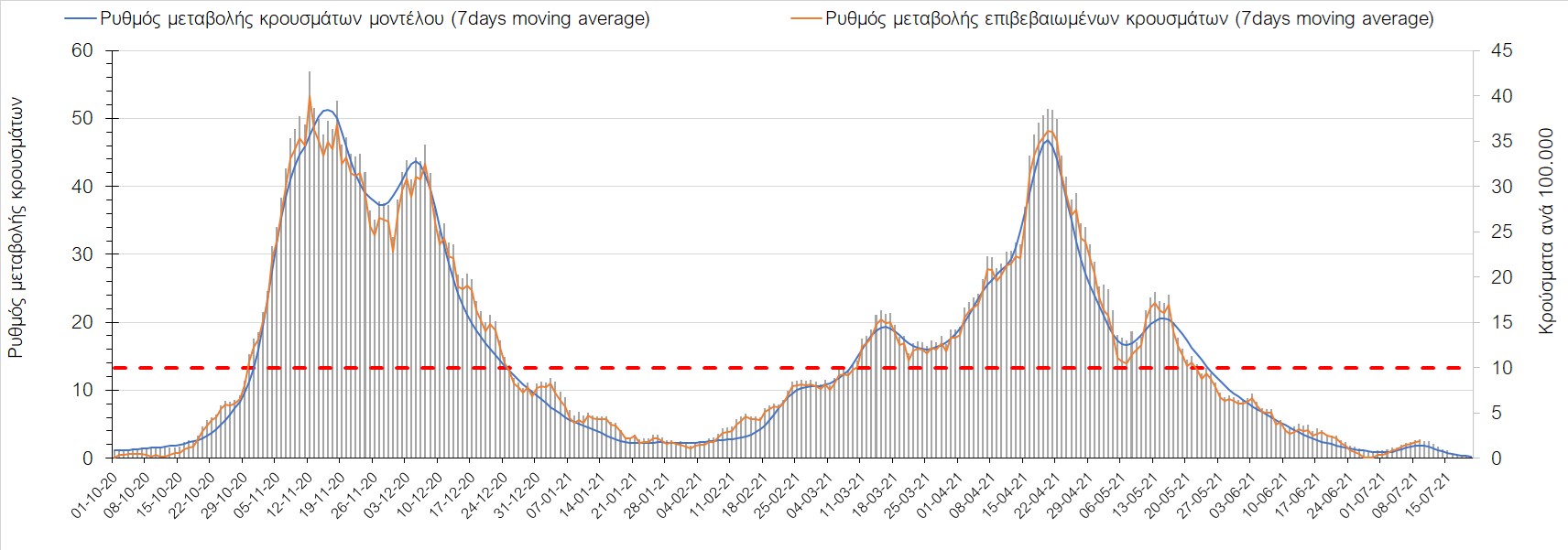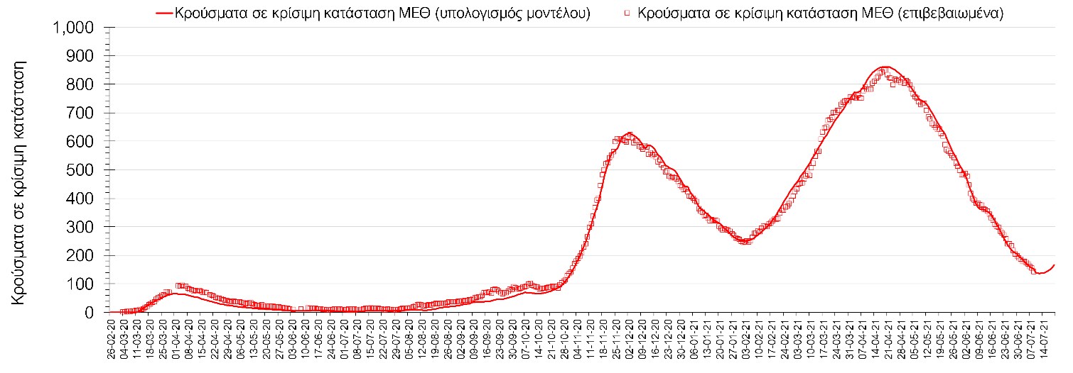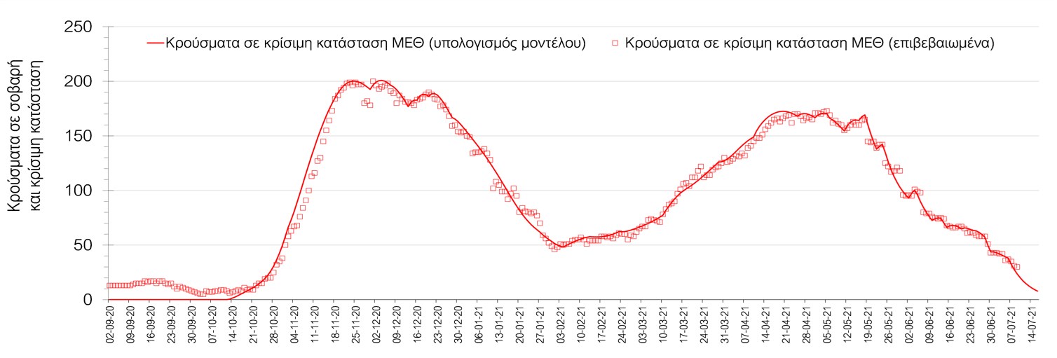 Σύμφωνα με τα στοιχεία του ΕΟΔΥ, ο αριθμός κρουσμάτων της Παρασκευής ανέρχεται στα 1.997 νέα κρούσματα, με τα αποτελέσματα να συνάδουν με τις αναθεωρημένες προβλέψεις της υπολογιστικής πλατφόρμας CORE (n=1960) που λαμβάνουν υπόψη την διασπορά όλων των μεταλλαγμένων στελεχών του SARS-CoV-2. Ο αριθμός των τεστ που πραγματοποιήθηκαν ήταν 68722 και σε συνδυασμό με τον αριθμό των κρουσμάτων, ο δείκτης θετικότητας διαμορφώθηκε στο 2,9%. Η πραγματοποίηση αριθμού τεστ σε επίπεδα άνω των 50.000 την ημέρα, συντελεί στο να εξάγουμε πιο ασφαλή συμπεράσματα σχετικά με την πορεία της πανδημίας, αλλά και να εντοπίζονται περισσότεροι ασυμπτωματικοί και προσυμπτωματικοί, συντελώντας στην ανάσχεση πιθανής έξαρσης που θα μπορούσε να συμβεί λόγω της εμφάνισης ολοένα και ταχύτερα μεταδιδόμενων στελεχών, σε συνδυασμό με τα υπάρχοντα ανοίγματα και τις τουριστικές ροές. Σημαντικοί σύμμαχοι σε αυτή την προσπάθεια αύξησης του αριθμού των τεστ ανίχνευσης του SARS-CoV-2 αποτελούν εκτός από τα rapid test και τα self test, για να καταπολεμηθεί η δυναμική αύξησης της διασποράς στις περιοχές όπου μια τέτοια αύξηση διαφαίνεται από τα μέχρι τώρα δεδομένα και την υπολογιστική πλατφόρμα CORE, αλλά και για να συνεχιστεί η πολύ καλή πορεία στο σύνολο της χώρας.Ο αριθμός ημερήσιων θανάτων (12) που καταγράφηκε την Παρασκευή είναι ελαφρώς αυξημένος σε σχέση με την Πέμπτη (10). Όπως είχαμε προβλέψει από την προηγούμενη εβδομάδα, ο κυλιόμενος εβδομαδιαίος μέσος όρος που την Παρασκευή είναι 9 συνεχίζει να είναι σε αποκλιμάκωση, αλλά σε πιο αργό ρυθμό από τον αναμενόμενο. Όσον αφορά στους ασθενείς σε κρίσιμη κατάσταση (διασωληνωμένοι σε ΜΕΘ), ο αριθμός μειώθηκε σε σχέση με προχθές (141 από 153). Παρά την παρατηρούμενη ανοδική πορεία των κρουσμάτων, συνεχίζεται ακόμη η αποκλιμάκωση στις ΜΕΘ, ενώ η άνοδος αναμένεται να ξεκινήσει μετά από περίπου 2-3 ημέρες. Η καμπύλη εξέλιξης του αριθμού των ασθενών που νοσηλεύονται σε κλίνες ΜΕΘ με βάση τις προσομοιώσεις της πλατφόρμας CORE, όπως αυτή παρουσιάζεται στο Σχήμα 1, των ασθενών που νοσηλεύονται σε απλές κλίνες στο Σχήμα 2 (όπου προχθές ξεκίνησε η αύξηση του αριθμού τους, ακολουθώντας την πορεία των κρουσμάτων), ενώ μια εκτίμηση για την πορεία των θανάτων ανά ημέρα παρουσιάζεται στο Σχήμα 3.