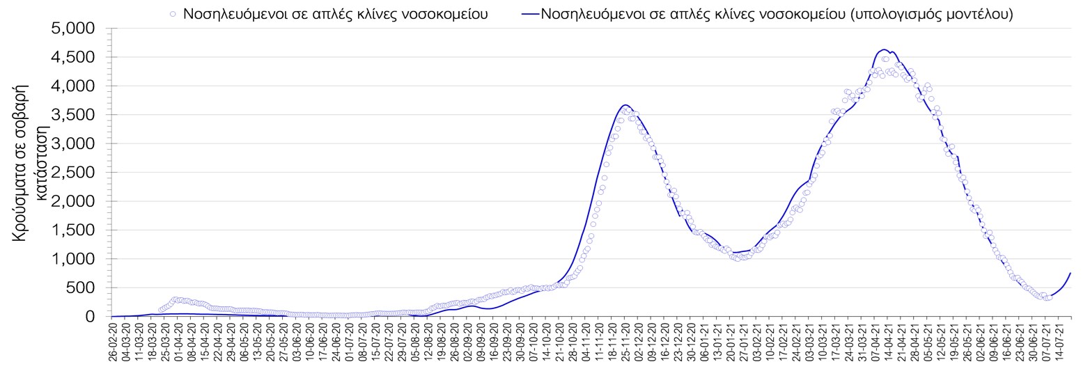 Σχήμα 2. Αριθμός κρουσμάτων σε σοβαρή κατάσταση (νοσηλευόμενοι σε απλές κλίνες) σύμφωνα με τα στοιχεία του ΕΟΔΥ και τις προβλέψεις της υπολογιστικής πλατφόρμας CORE.