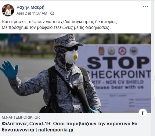 “Εγώ θα κοινωνήσω γιατί είμαι Ελληνίδα Χριστιανή Ορθόδοξη και κανείς δεν μπορεί να μου το απαγορεύσει! Γιατί αντιλαμβάνομαι πως αυτό το ελληνόφωνο πολιτικό προσωπικού του Χάρβαρντ του Ροκφέλερ εκτελεί σχέδιο και εντολές δίωξης του Χριστού και της ορθοδοξίας” αναφέρει σε ανάρτησή της η Ραχήλ Μακρή. Η πρώην βουλευτής είναι πολύ ενεργή στον λογαριασμό της στο facebook.