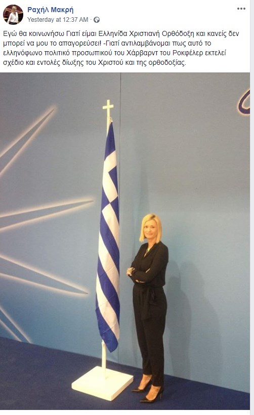 “Εγώ θα κοινωνήσω γιατί είμαι Ελληνίδα Χριστιανή Ορθόδοξη και κανείς δεν μπορεί να μου το απαγορεύσει! Γιατί αντιλαμβάνομαι πως αυτό το ελληνόφωνο πολιτικό προσωπικού του Χάρβαρντ του Ροκφέλερ εκτελεί σχέδιο και εντολές δίωξης του Χριστού και της ορθοδοξίας” αναφέρει σε ανάρτησή της η Ραχήλ Μακρή. Η πρώην βουλευτής είναι πολύ ενεργή στον λογαριασμό της στο facebook.