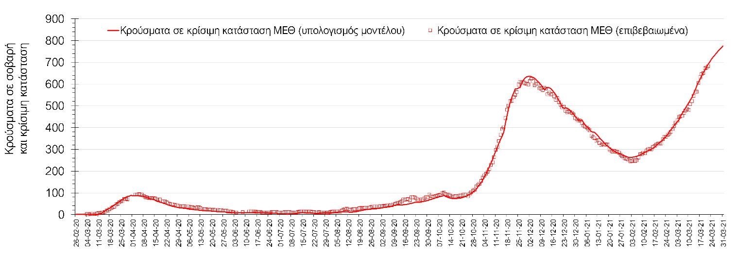 Σε ό,τι αφορά τους ασθενείς σε κρίσιμη κατάσταση (διασωληνωμένοι σε ΜΕΘ), ο αριθμός τους αυξήθηκε κι άλλο τη Δευτέρα σε σχέση με την Κυριακή (681 από 674), ενώ, σύμφωνα με τις τελευταίες εκτιμήσεις του κ. Σαρηγιάννη, αναμένεται να πλησιάσουν ίσως και τους 780 μέχρι το τέλος του Μαρτίου με βάση την επικαιροποιημένη πρόβλεψη, εάν συνεχιστεί ο ίδιος ρυθμός αύξησης. “Αξίζει να σημειωθεί ότι ο αριθμός των ασθενών σε κρίσιμη κατάσταση όπως και των θανάτων είναι αναλογικά χαμηλότερος σε σχέση με τα αντίστοιχα μεγέθη στο δεύτερο κύμα, τόσο λόγω των εμβολιασμών ευπαθών ομάδων, όσο και του υψηλότερου αριθμού τεστ ανίχνευσης, που συντελεί στον εντοπισμό περισσότερων ασυμπτωματικών ή ήπια συμπτωματικών κρουσμάτων. Επίσης, η διασπορά των μεταλλαγμένων στελεχών που έχουν μεγαλύτερη μεταδοτικότητα από το στέλεχος του SARS-CoV-2 που κυριαρχούσε μέχρι το τέλος Φεβρουαρίου και η αυξημένη κινητικότητα του πληθυσμού έχουν μεγαλώσει το ποσοστό των νεότερων ηλικιών που μολύνονται με αποτέλεσμα η μέση ηλικία των μολύνσεων να έχει πέσει σημαντικά” αναφέρουν στην έκθεσή τους ο καθηγητής του ΑΠΘ Δημοσθένης Σαρηγιάννης και ο Δρ. Σπύρος Καρακίτσιος.