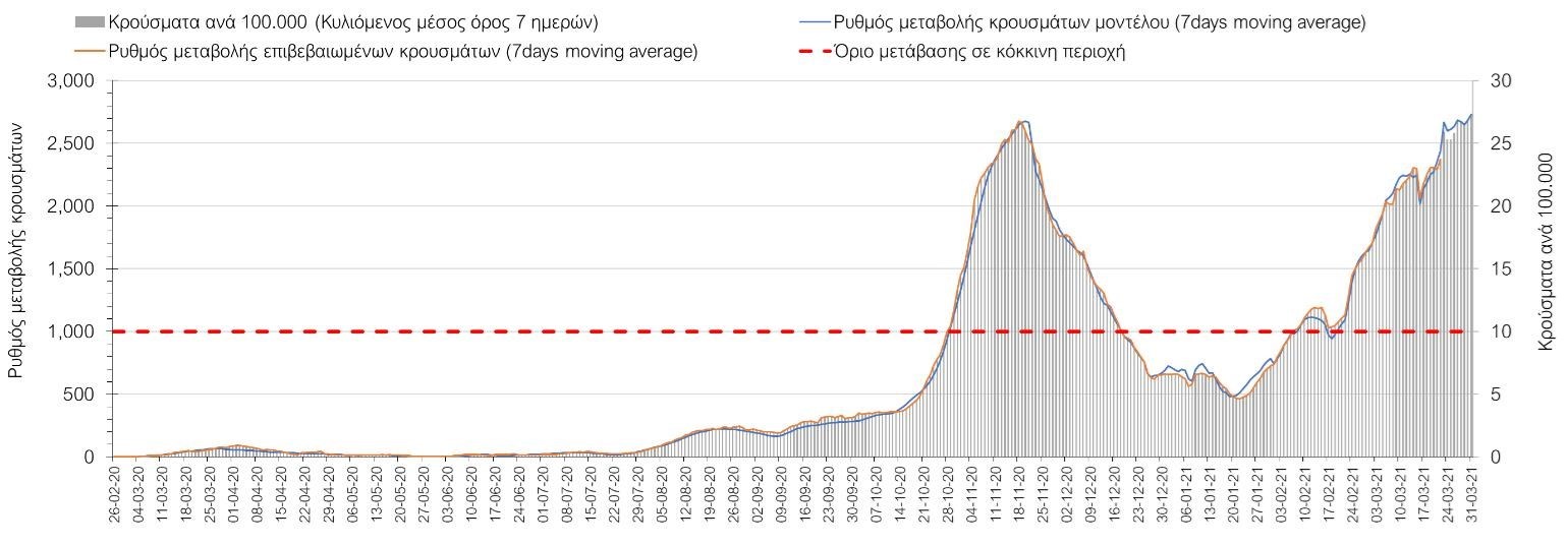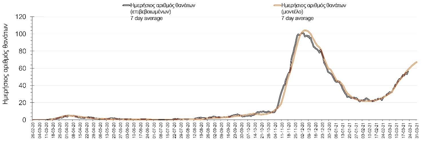 Τη Δευτέρα αυξήθηκε σημαντικά και αριθμός των θανάτων σε σχέση με την Κυριακή (41) καθώς ανακοινώθηκαν 69 νεκροί σε ένα 24ωρο. Σύμφωνα με τους ειδικούς, ο κυλιόμενος εβδομαδιαίος μέσος όρος που είναι 56, αναμένεται να αυξηθεί περαιτέρω μέχρι και κοντά στα 70 μέχρι το τέλος Μαρτίου (σε επίπεδο μέσης εβδομαδιαίας τιμής), με δεδομένη την αύξηση του αριθμού των κρουσμάτων και την αύξηση του αριθμού των διασωληνωμένων.