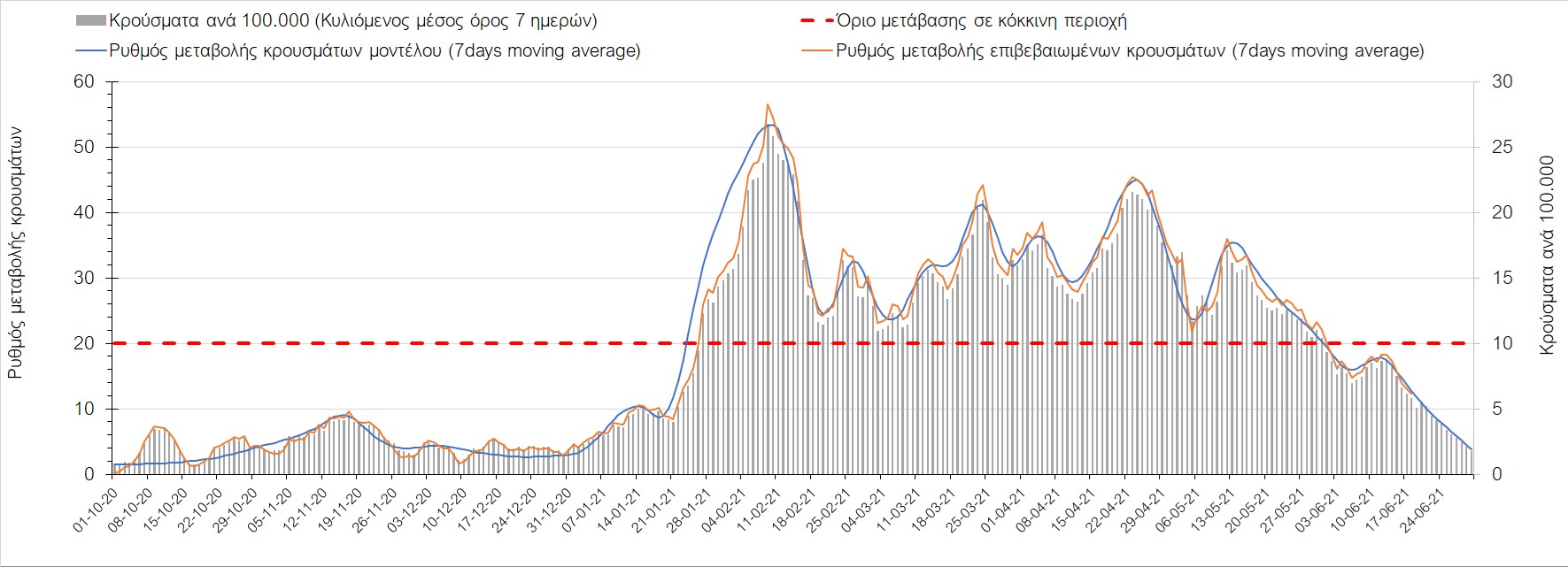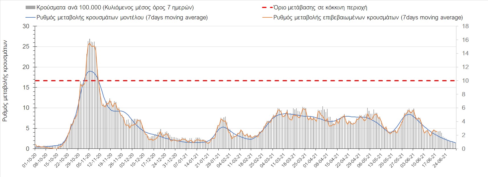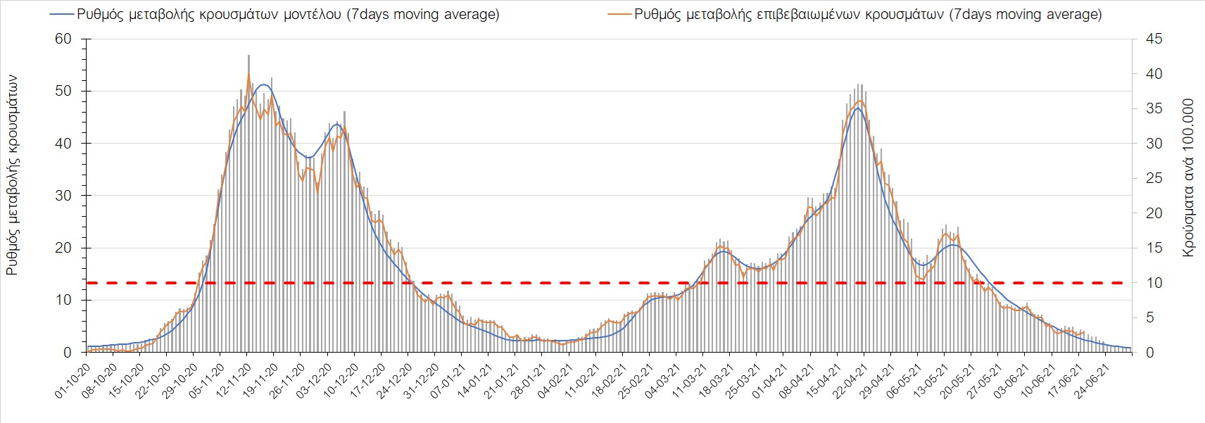 - σε μικρότερο βαθμό η πρόοδος των εμβολιασμών, η σημασία των οποίων στον έλεγχο της πανδημίας θα αρχίσει να είναι πιο εμφανής από το τέλος του Ιουνίου, λαμβάνοντας υπόψιν τη σημαντική αύξηση του ρυθμού εμβολιασμού από τα μέσα Απριλίου, με περίπου 110.000 εμβολιασμούς ημερησίως. Αξίζει να σημειωθεί ότι τις τελευταίες ημέρες παρατηρείται μια επιβράδυνση του ρυθμού εμβολιασμού. Τις επόμενες ημέρες, θα παρουσιάσουμε τις αναθεωρημένες προβλέψεις μας, λαμβάνοντας υπόψη την επιβράδυνση αυτή, οι επιπτώσεις της οποίας θα φανούν μετά τις αρχές Ιουλίου.